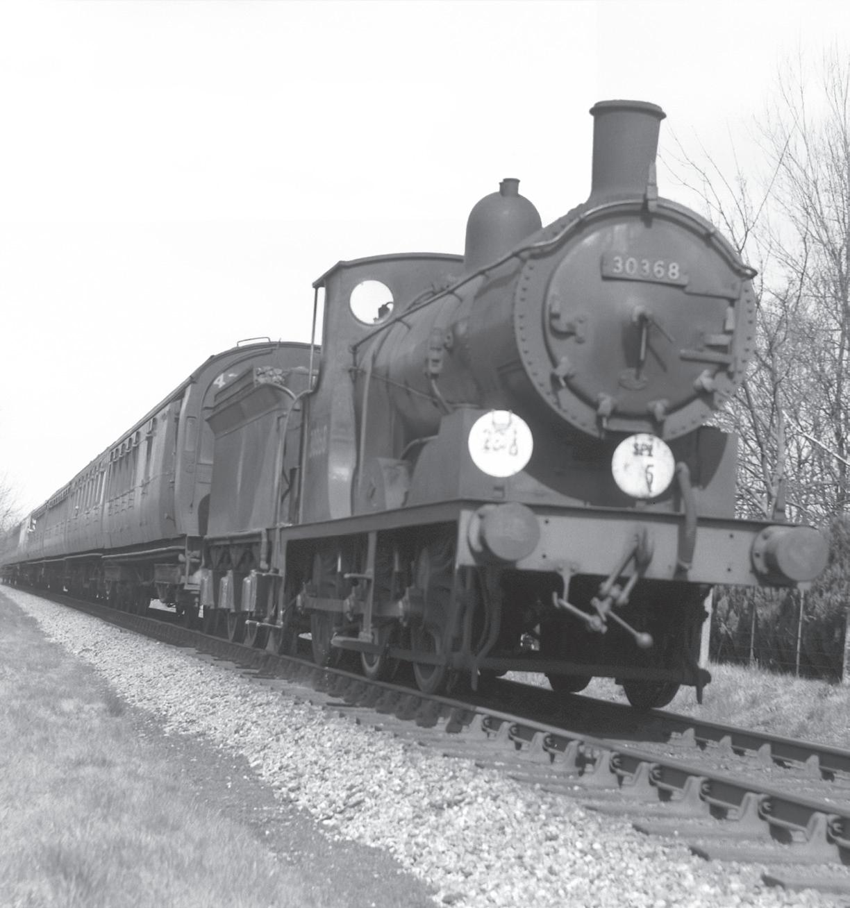 Above: On 1 April 1955 Drummond 700 Class No. 30368 was photographed near Bramley. Dating from 1897, this 0-6-0 would last in service until withdrawal at the end of 1962, being part of the drastic cull of pre-Grouping steam then undertaken by the Southern Region. (Peter Hay)
