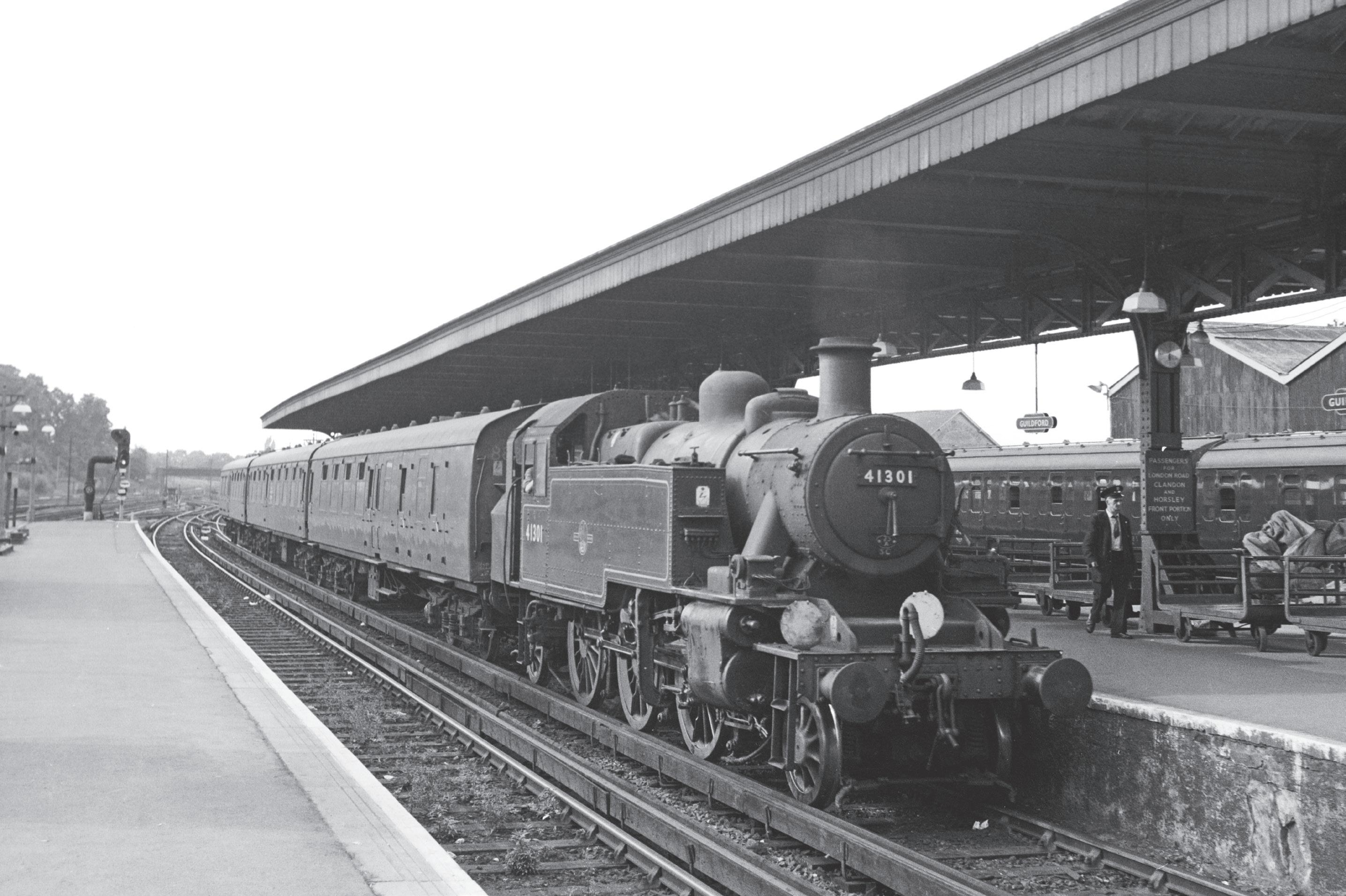 In this view taken from the Guildford platform the attractive footbridge can be seen as Ivatt tank No. 41303 waits to depart on 24 March 1961, whilst a member of the platform staff chats to the driver. Although the main station building has been rendered, there seems to be a problem with damp under the eaves. (Terry Gough)