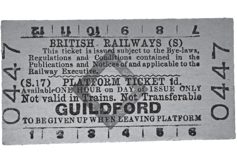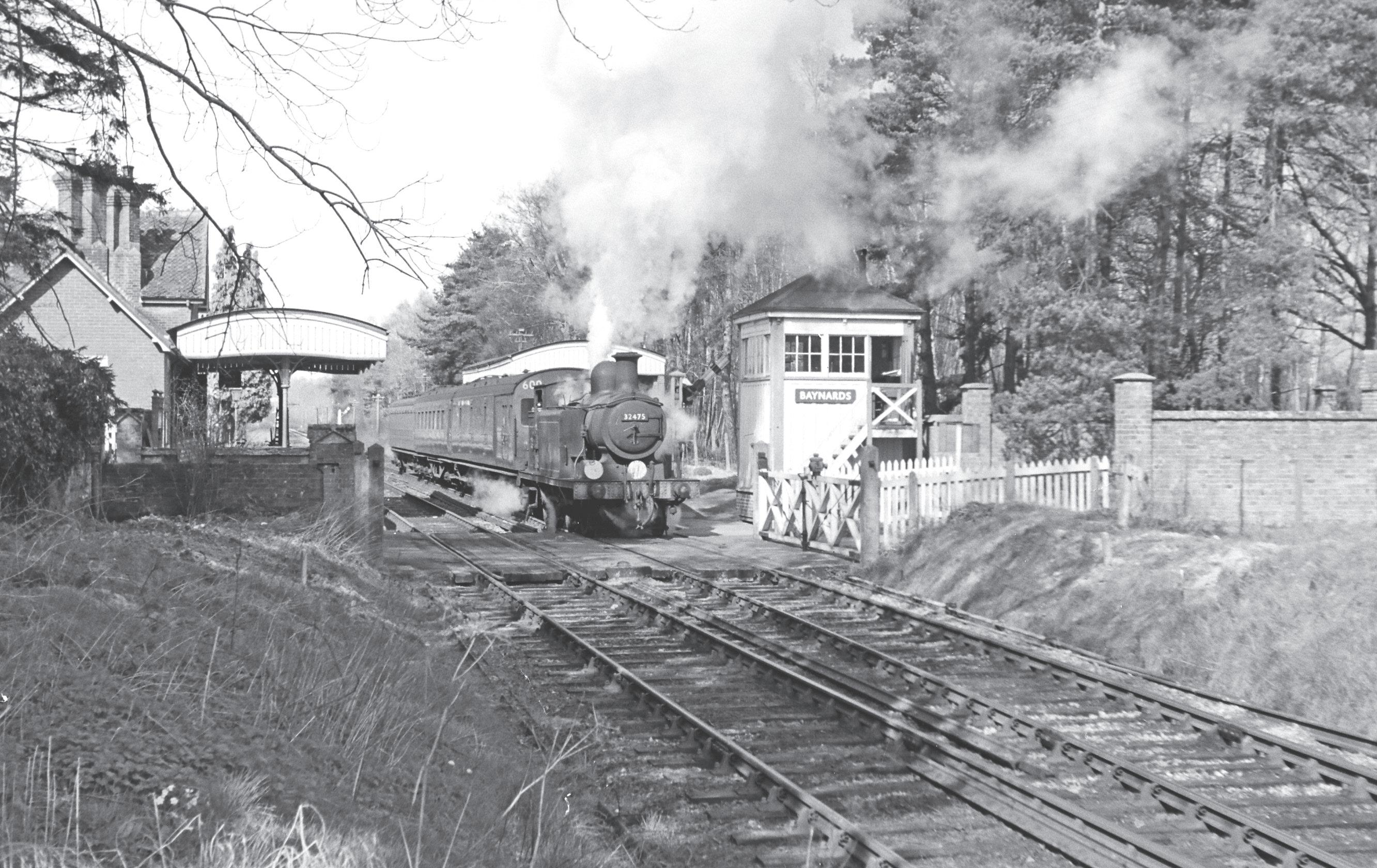 Right: Peasmarsh Junction was where the branch met the electrified Portsmouth main line and this view captures the moment on 30 June 1964 when the fireman of Ivatt tank No. 41301 hauling the 6.05pm service from Guildford to Horsham receives the staff from the signalman. The former SE&CR line from Redhill to Reading lies just to the north of this junction and an embankment was constructed to accommodate a spur allowing through running to Portsmouth. However this scheme was abandoned once the L&SWR had acquired the Portsmouth route from its speculative constructor and is shown as “Dismantled” on this map dating from 1920. (Leslie Freeman)