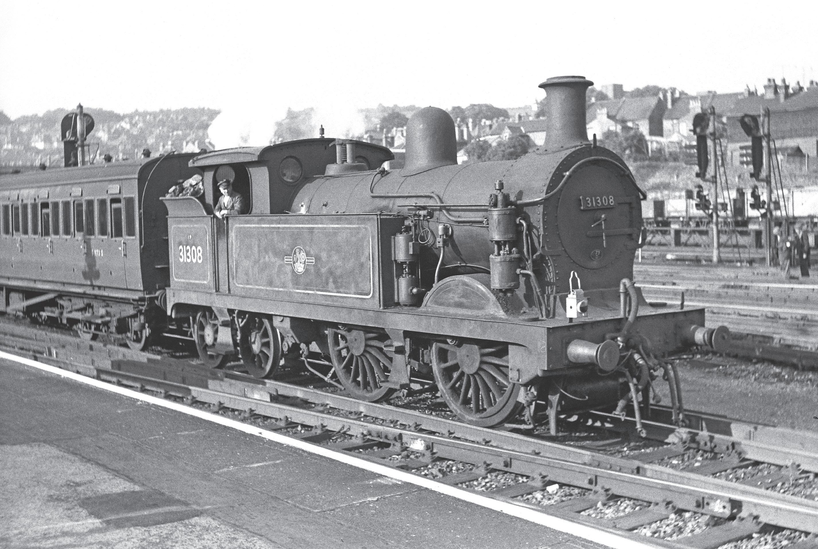 On 15 July 1959 H Class 0-4-4T No. 31308, which had been reallocated to Brighton shed the previous month, has recently arrived with a service from Horsham. It will shortly return thence, the tail lamp having already been placed in position on the buffer beam. Colour light signals, some examples of which are seen in the background, had been introduced at Guildford as early as 1937. (Peter Pescod)