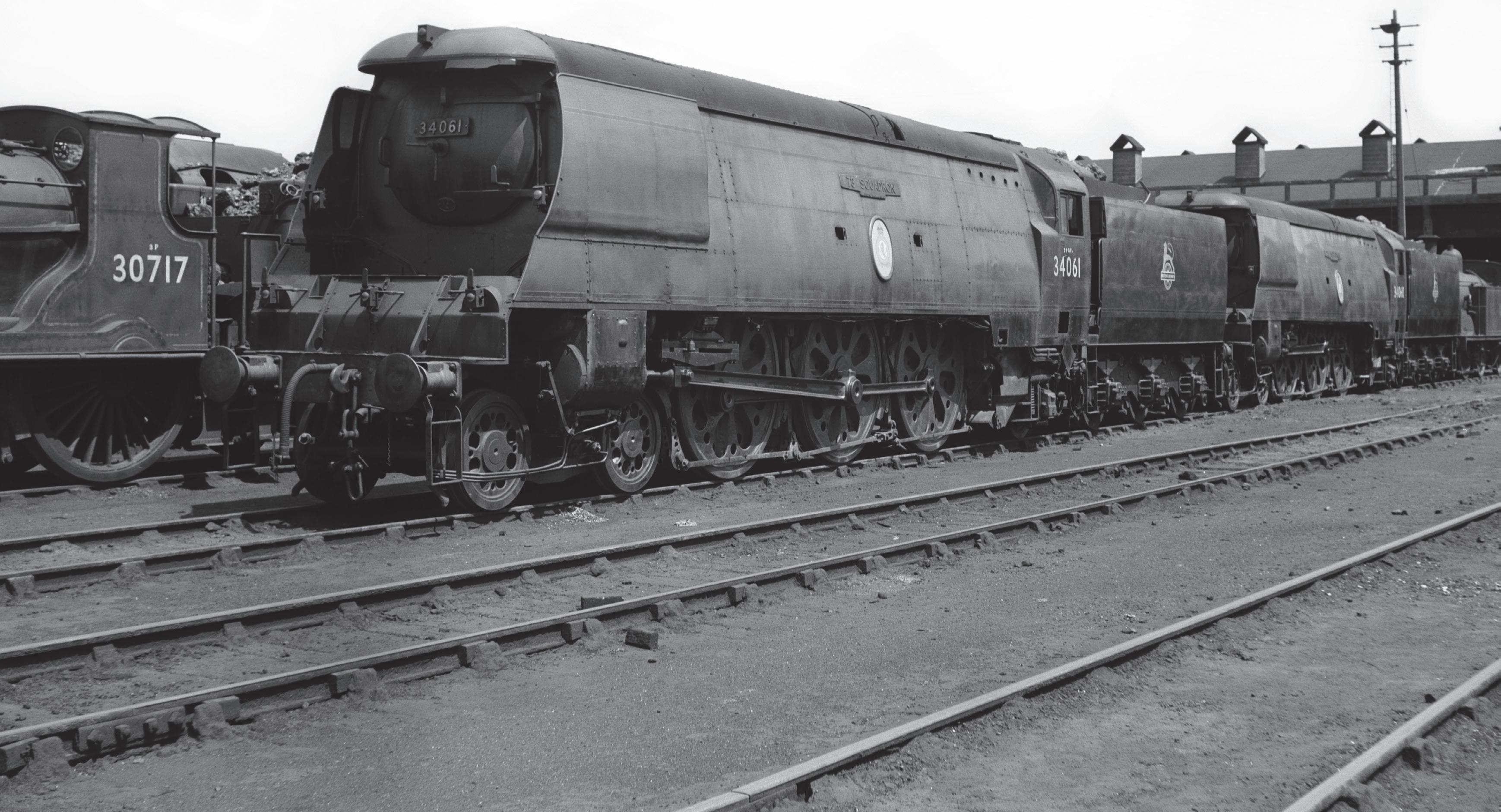 Below: Exmouth Junction (72A), the principal shed for the Southern lines in the south-west, was situated on the north side of the main line at Exeter, at the point where the Exmouth branch diverged to the south-east. Unrebuilt Bulleid ‘Battle of Britain’ Pacifics Nos 34061 73 Squadron and 34060 25 Squadron stand outside their home shed on Tuesday 7 June 1955, alongside ‘T9’ No 30717, also allocated to 72A. No 34061 remained in original unrebuilt condition until withdrawal from Eastleigh shed in August 1964. No 34060, in contrast, would be rebuilt at Eastleigh works in November 1960, and withdrawn from Eastleigh shed at the end of Southern Region steam in July 1967. The ‘T9’, built by Dübs & Co in 1899, would survive to be one of the last examples of this long-lived class, being condemned from Eastleigh in July 1961.