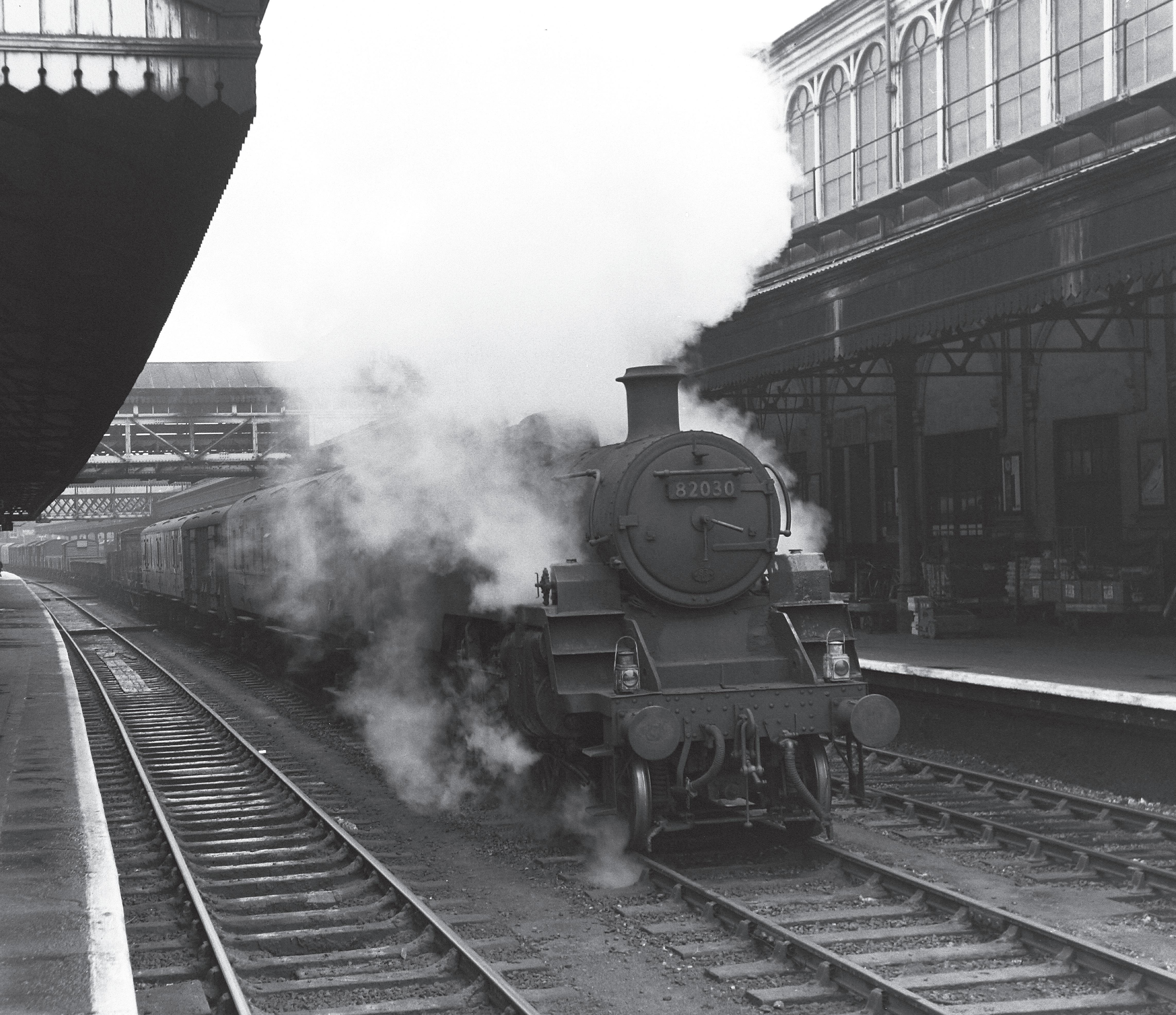 ‘4300’ class No 6371 stands at platform 4 at Exeter St David’s on a damp Saturday 20 December 1958 with the 1pm Saturdays only Exeter - Kingswear, formed of seven coaches. No 6371 was the second of the 35 members of Class 4300 which were built by Robert Stephenson (Nos 6370-99 and 7300-04). It would spend just a matter of weeks as an Exeter locomotive between November 1958 and January 1959 before the call of the Dyfi (Dovey) estuary would take it back to its former home at Machynlleth shed (89C), where it would be withdrawn less than two years later, on 21 September 1960.