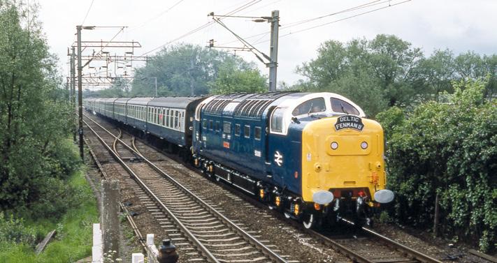 25th May 1981 • No. 55009 Alycidon is seen from the steps of Spellbrook signal box which was situated between Sawbridgeworth and Bishops Stortford on the Liverpool Street to Cambridge line. The occasion was the Deltic Fenman 2 from Finsbury Park to Wansford out via the Lea Valley to Cambridge, Ely and March to Peterborough. Very few Deltics ever worked this route, they were more common between Cambridge and Ely via March when East Coast main line services were diverted due to engineering work.
