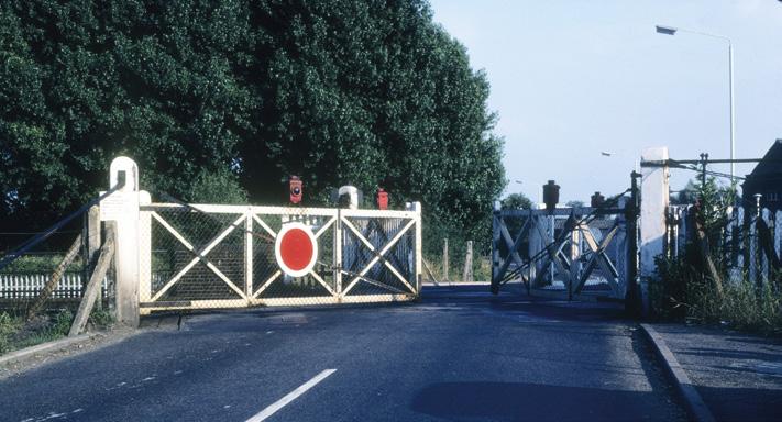 August 1979 • The wooden gates seen late on Sunday evening when the sun has come around. We are looking from Hoddesdon towards Dobbs Weir and the power station ground is behind the trees on the left. Note the red oil LNER lamps on top of each gate.