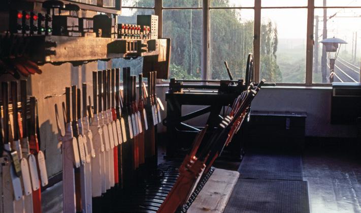 • The view of the 35 lever frame and block bells. Only the Roydon one is modern far right. Note the crossing wheel, used to open and close the crossing gates so many times on a twelve hour shift it kept us all very slim and fit. From memory there were nine white levers at the time, indicating not used.
