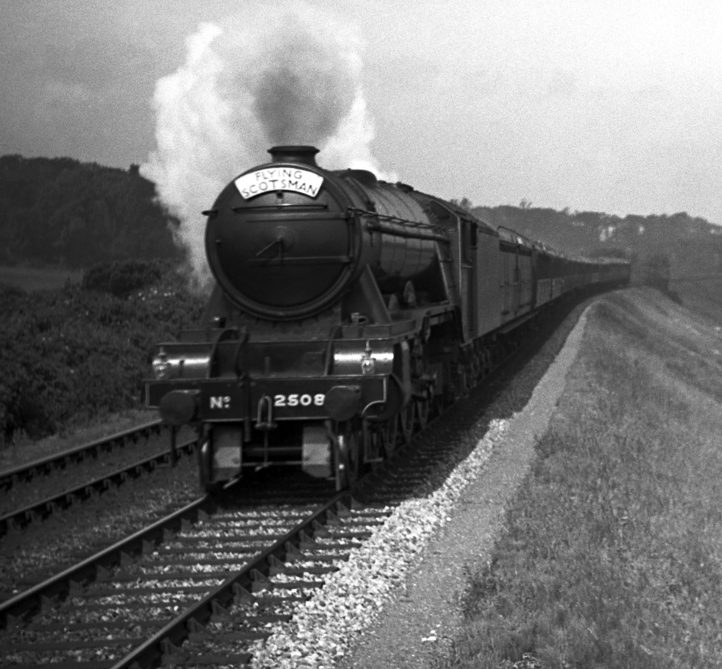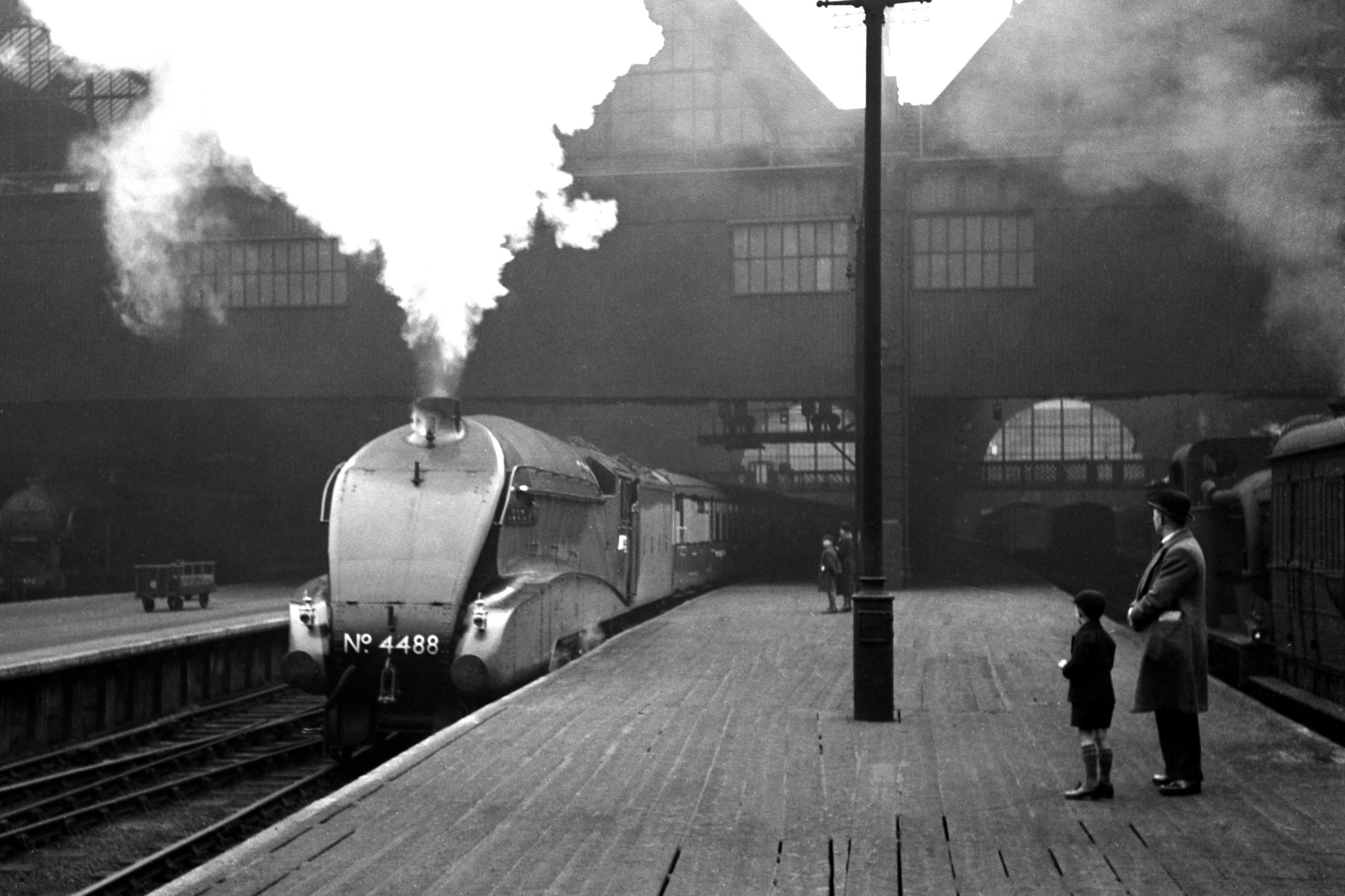 Thursday10March1938.Witha4.00pmdeparturefromKing’sCrossstationinLondonandasixhourjourneytimetoWaverleystationinEdinburgh,‘The Coronation’,inauguratedinJuly1937,sawthefastesttimebetweenthetwocities.Onewonderswhattheyoungenthusiast,standingontheplatformatKing’s Crosswatchingitsdepartureonthisday,couldpossiblybethinking.LNERClassA44-6-2No4488 UnionofSouthAfrica ismakingaverysmartdeparture.A productofDoncasterWorksin1937,shewouldbecomeNo60009withBritishRailways,bewithdrawnfromservicein1966andpurchasedprivately.Returningto mainlineserviceinlateryears,shewouldbeseenhaulingspecialsaroundtheUK.(GB522)