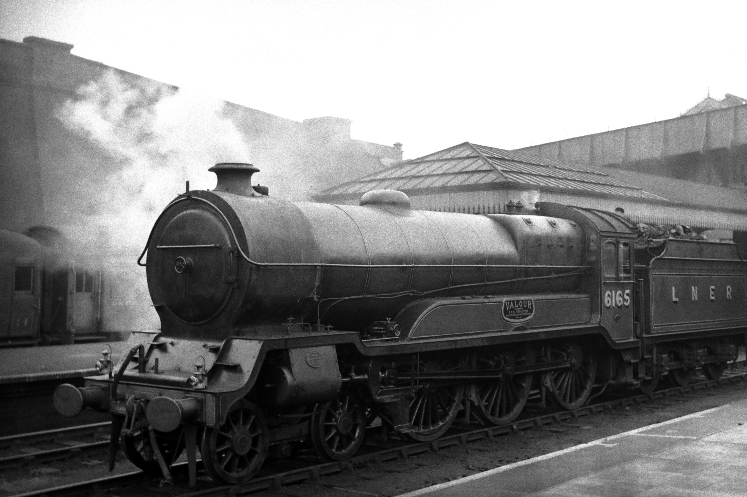 August1938.Thiscloseupofex-GCRClass9P(LNERClassB3)4-6-0No6165 Valour atNottinghamVictoriastationshowsclearlythepowerfullinesofthis class.This4-cylinderdesignofexpresspassengerlocomotivesawonlysixexamplesbeingconstructed,allutilisingStephensonvalvegear,atGortonWorks withNo6165enteringservicein1920.OveraperiodofyearsfourmembersoftheclasswererebuiltwithCaprottivalvegear,butNo6165,alongwithclass premierlocomotiveNo6169,escapedthischange. Valour wasnamedinmemoryoftheGCRstaffwhodiedduringtheFirstWorldWarandwouldbewithdrawnin 1947.(GB615)