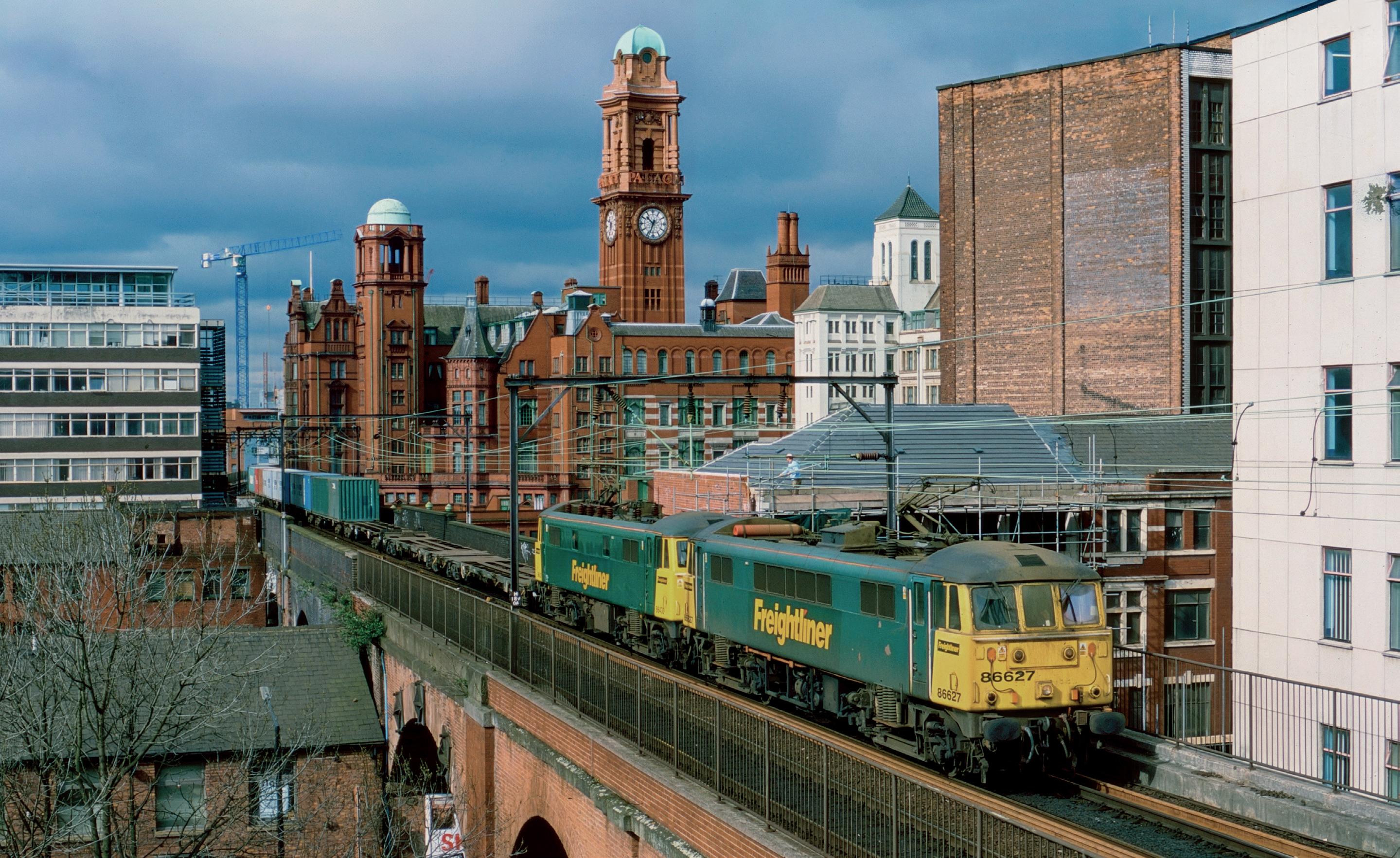 Double-headed Class 86s head a Freightliner service across Oxford Road viaduct on 7 April 2004. The Class 86s were built in 1965/66 to haul services on the electrified West Coast main line, originally designated AL6 they were numbered E3101-E3200 with the change to Class 86 when the Total Operations Processing System (TOPS) classification was introduced; a computer system implemented in the early 1970s, to streamline the process of locomotive, carriage and wagon management on the UK rail network. Freightliner inherited 30 Class 86/6s that had previously been operated by Railfreight Distribution and Rail Express. No 86627 was new from Doncaster Works as E3110 on 19 June 1965, after several refurbishments and renumbering it obtained its current number on 7 October 1998. No 86430 entered traffic the same day, as E3105, and was hired from English, Welsh & Scottish Railways (EWS) when it withdrew its last operational members of the class – 86430, and classmate 86426, were returned to EWS when the need for additional locomotives was reduced and subsequently withdrawn in June 2004 and scrapped. Following withdrawal by Freightliner No 86627 was exported to Bulgaria for further use. (Andrew Royle)