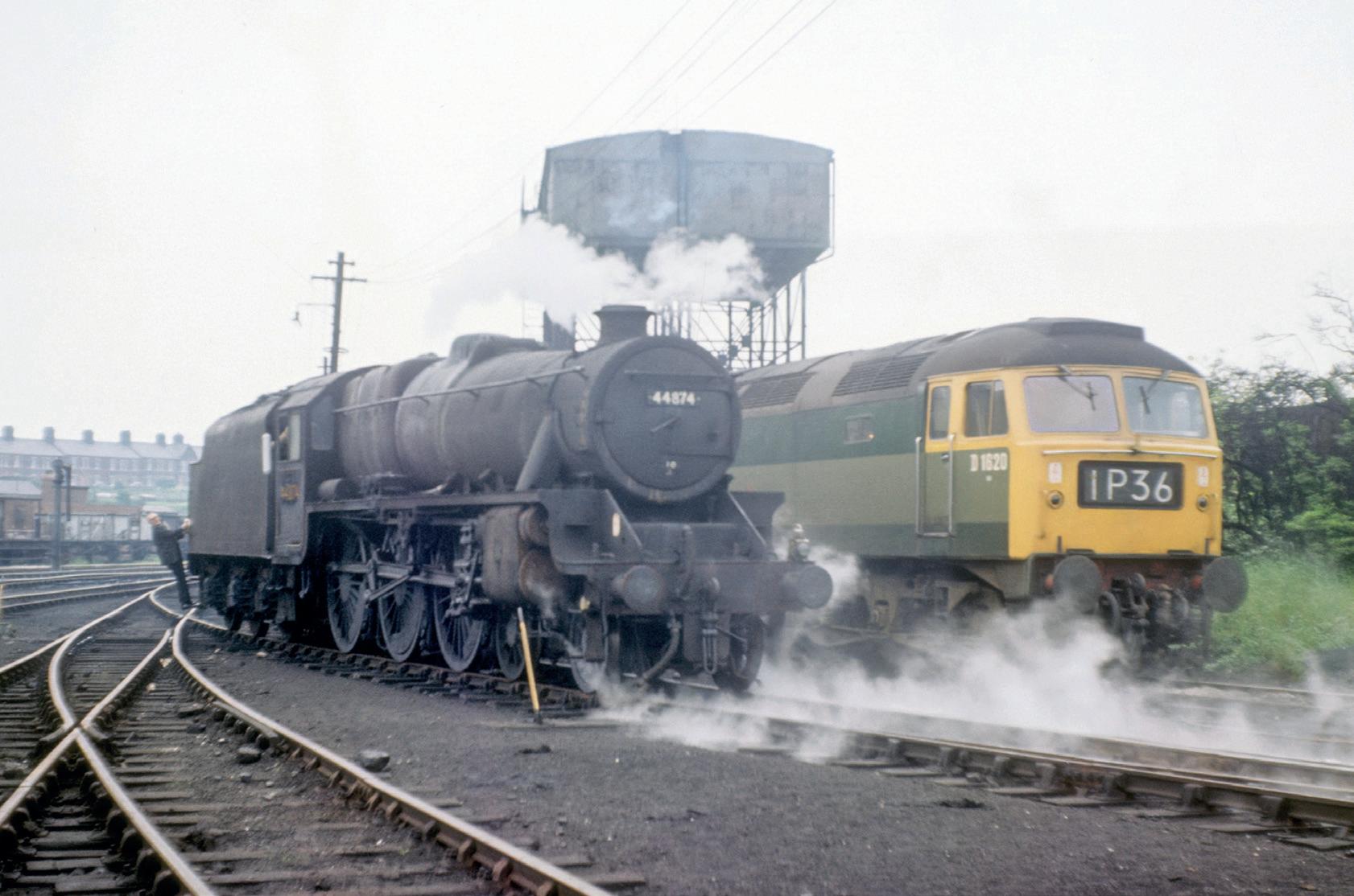 The old and new orders stand alongside at Patricroft depot in early spring 1968. Stanier Class 5 No 44874 emerged from Crewe Works in April 1948 as LMS No 4874. It gained its BR number in early October 1948 whilst allocated to Crewe South, by the date of this photograph it was shedded at Carnforth from where it was withdrawn a few days before the end of main line steam. A little over 20 years later on 17 October 1964, Class 47 No D1620 entered traffic from the same works and was allocated to the Stoke Division when seen alongside No 44874. The Brush Type 4 was renumbered 47039 during February 1974 and again to 47565 on 16 November 1980 following the fitment of eth equipment. It was withdrawn from Bristol Bath Road depot on 1 January 2000. (Bernard Mills)