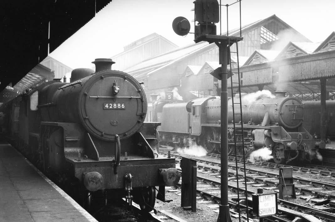 Below: One of the class of locos with improved average mileage, as described in the table opposite, Hughes/Fowler ‘Crab’ Class 5MT No. 42886 is pictured at Crewe with Stanier ‘Black Five’ No. 44782 at the opposite platform.