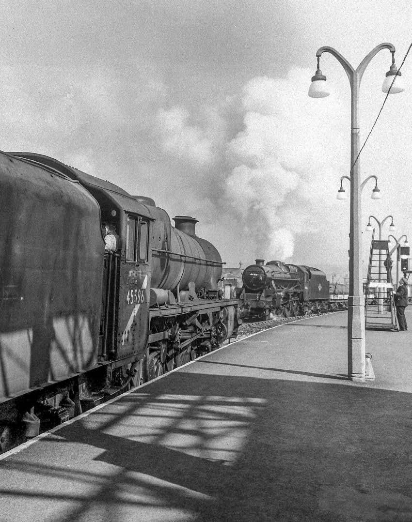 30th March 1965 • Once a Huddersfield engine, but now of Stockport, Stanier ‘Jubilee’ Class 6P5F 4-6-0 No. 45596 Bahamas awaits departure eastwards at Huddersfield as ‘Black Five’ 4-6-0 No. 44816 is about to pass on a freight working.