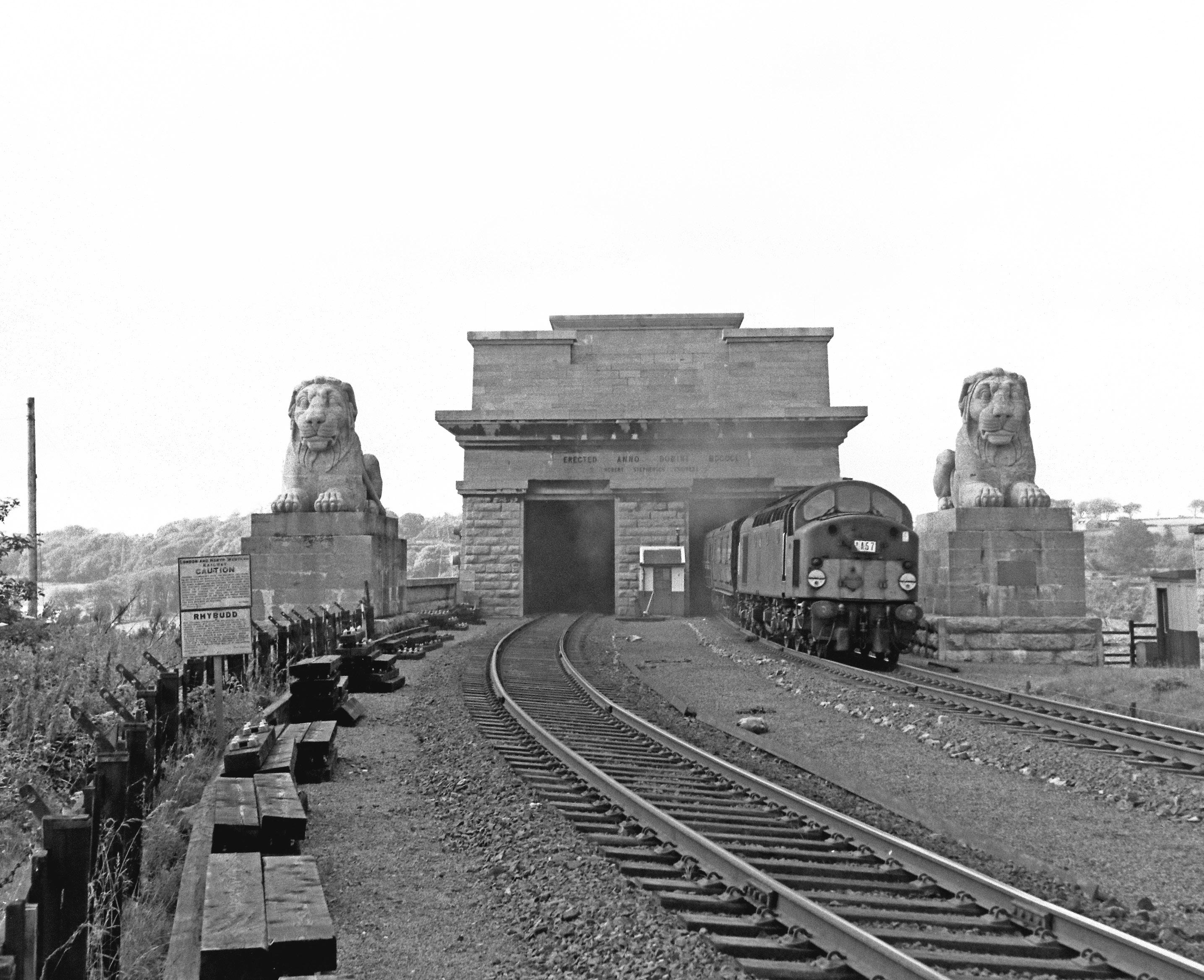 regularly with Camden based locomotives such as Coronation Pacifics or English Electric 2000hp diesel locomotives. Note the bilingual “Caution” trackside signs, still bearing the heading London & North Western Railway, in both English and Welsh. The inscription on the bridge reads “Erected Anno Domini MDCCCL Robert Stephenson Engineer”. (Norman Kneale)