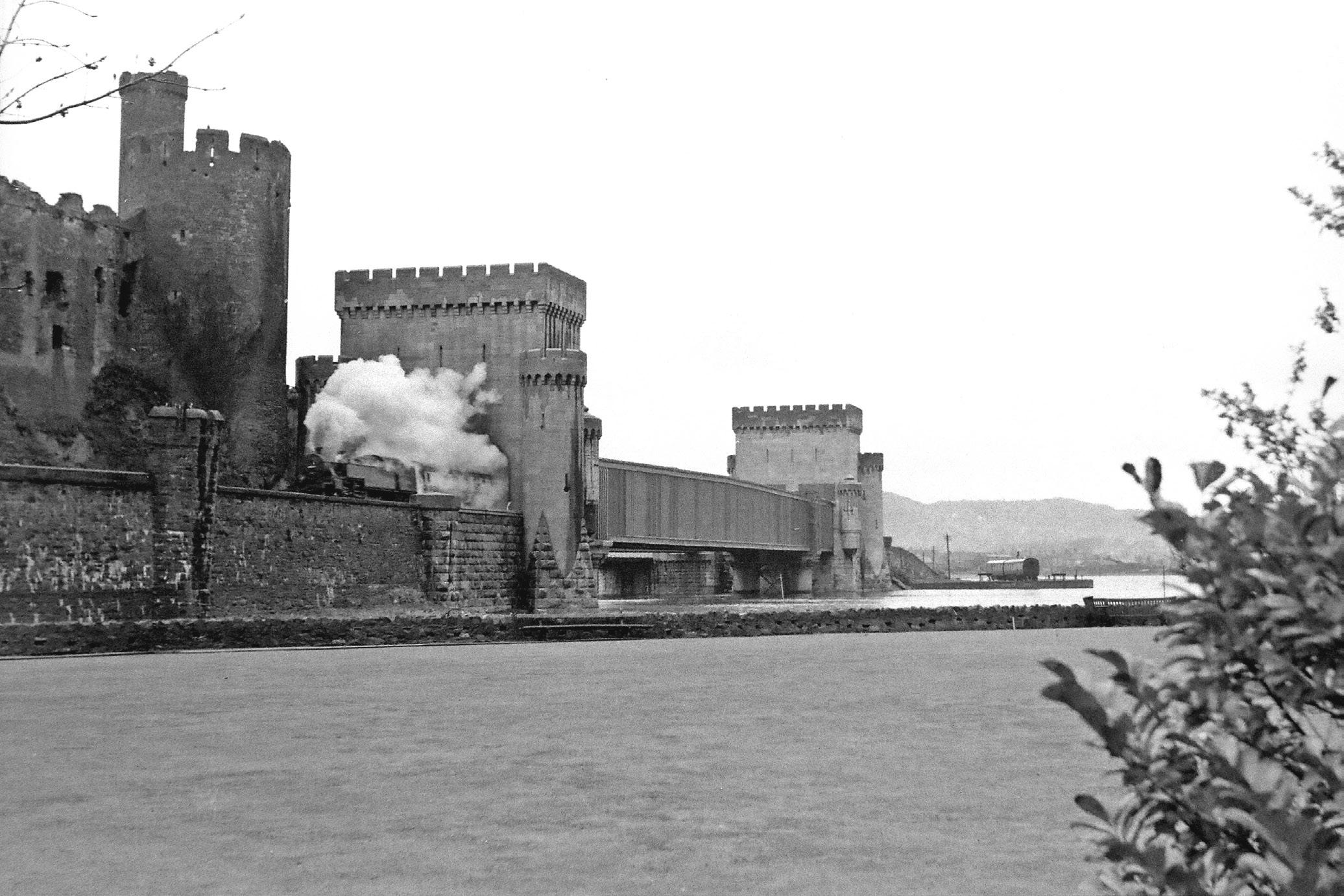 Erupting in a cloud of smoke and steam from the castellated portal of the rail bridge at Conway comes an unidentified 2-6-2T with a down local service passing the 13th. century castle, one of those constructed by Edward I to subdue the Welsh. Constructed in just four years between 1283-7 it is now a World Heritage site containing the most complete set of medieval royal apartments in the whole of the principality. (Milepost)