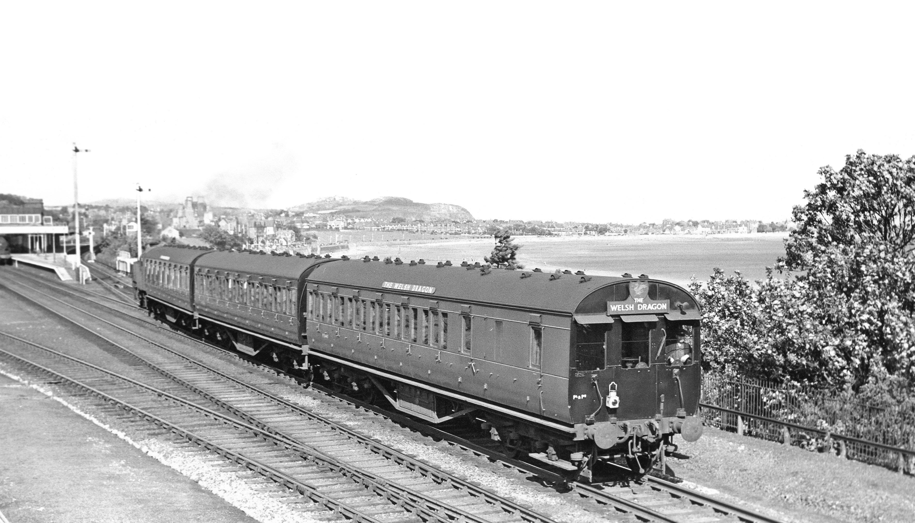 Left. Having just negotiated Marine Crescent’s level crossing, whose gateposts can be seen in the foreground, this pair of Derby Lightweight DMUs calls at Deganwy’s down platform on 26th. June 1962 with a service from Llandudno. It may possibly be operating one of the ‘Welsh Dragon’ tours, see page 68, which ran between Llandudno and Rhyl during the holiday season although in 1962 the DMU service had been replaced by a steam powered one. The coaching stock seen in the background is on land that formed part of Deganwy docks which were constructed by the L&NWR to handle slate traffic. With the decline in slate traffic, boat building became important in the dock area and after WW2 BR used some of the sidings to store coaches that were used for such specials as the ‘Land Cruise’ trains and to house excursion coaching stock that had brought hundreds of day-trippers to Llandudno. Even Royal Trains were from time to time temporarily housed there overnight. Today a yacht marina, hotel and spa occupy the site. (W. A. C. Smith)