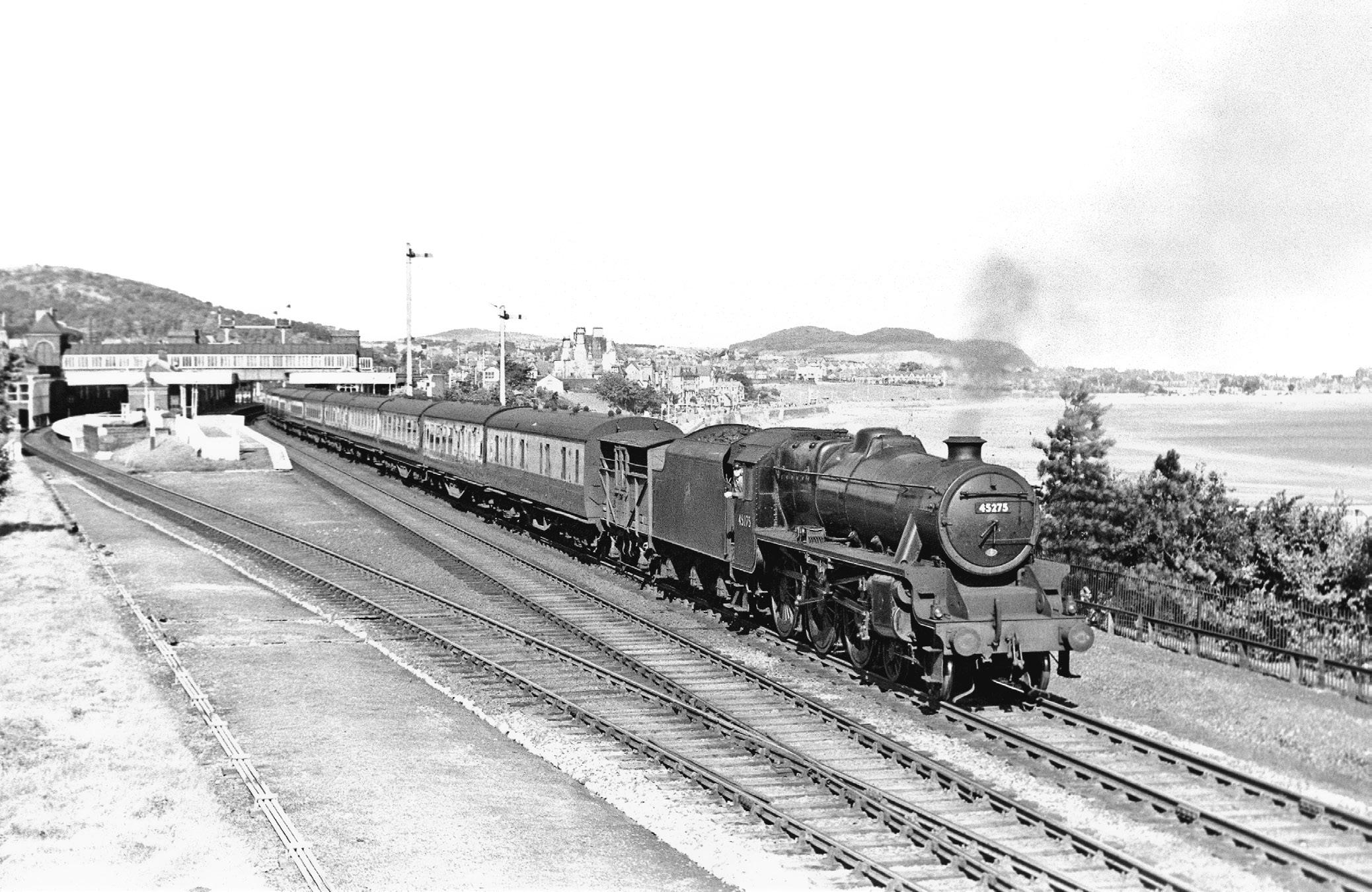 Black 5 No. 45275 restarts its train from Colwyn Bay in September 1953. Tucked behind the tender is a solitary cattle wagon reflecting the importance of this traffic, much of which came across the Irish Sea “on the hoof” and was landed at Holyhead. There was also a brisk trade in “dead stock” carried in containerised meat vans. (Roy Vincent)
