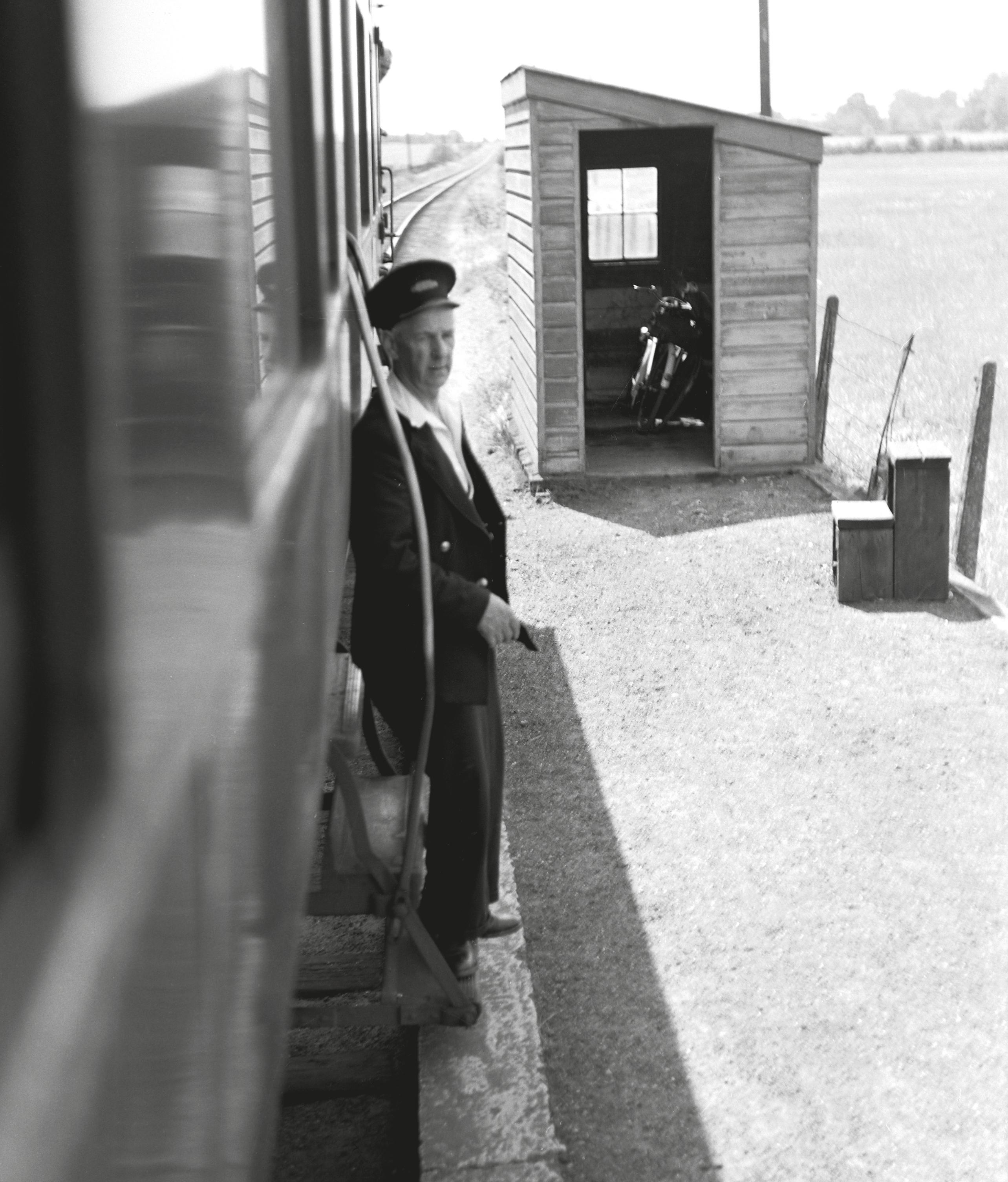 Ref79.At2miles75chains‘out’fromPrinces Risborough,WainhillCrossingHaltonthe Watlingtonbranchwasatinyrail-level platformopenedbytheGWRon1August 1925aspartoftheireffortstodrumupextra tradeinruralareas.Wainhillwassoremote thattheThameGazettewasmovedto commentsomewhattartlythat‘Itwillservethe hillschiefy’.Nevertheless,thestation remainedopenforbusinessuntilthe passengerserviceceasedin1957.Inthis photographtheguardhassetdowntheautotrailerstepstoplatformlevelandisreadyto assistanyascendingordescending passenger.Thesetofwoodenstepsseen outsidethebikesheddoubledasspare boardingstepswhenaconventionalcarriage wasinuseandalsoas‘assists’forstaffto reachuptohooktheplatformlampsontothe platformposts. H65