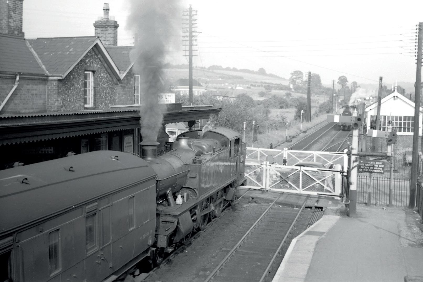 RearcoverRef2.TakenfromthefootbridgeatBourneEndstationon17September1958,thisviewlooksnorth-eastacrosstheStationRoadlevelcrossing towardsWooburnGreen.Animmaculate61XX2-6-2TNo.6115ofSloughshedwaitsforclearancewithaserviceforHighWycombewhilstbeyondthe interestingbracketsignalandcrossinggatesanotherPrairie,Oxford’s5190,issimilarlyheldwithasouthboundfreight.AfterclosureoftheHighWycombe sectioninMay1970,theroutebeyondthelevelcrossingwasabandonedmakingthestationaterminuswiththelinefnishingatbufferstopsjustshortof thecrossinggateswhereNo.6115isstanding.TherouteofthelinebeyondthegatesisnowpartoftheBostonDrivehousingdevelopment. H377