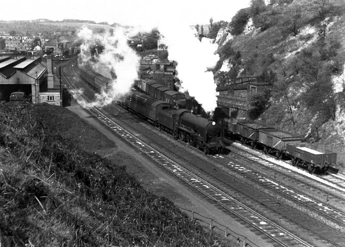 R. Hobbs 1023Bottom: The Birkenhead again, but this time going in the other direction on a rather sunnier weekday in 1958. Schools class 30912 Downside has duty 485 on this occasion and is departing eastwards at 2.38pm for Margate but will now travel via Ashford and Canterbury West instead of the longer route via Dover. Arrival at Margate is scheduled for 4.46pm. The train left Birkenhead at 7.35am, so a long day travelling for anyone making the full journey. Six Maunsell coaches; five in green, with an open third (now second) in blood and custard; whether there is a restaurant car as the second vehicle is not clear. The Brighton portion of the train will follow this out, down the main line towards Earlswood, behind an L class 4-4-0 from Tonbridge shed (duty No 293). The rather curiously shaped brick abutment behind Downside is a retaining wall and ventilation shaft above the mouth of Redhill tunnel, where the Quarry line dives underneath the Tonbridge route; the line passing diagonally across the photograph at this point. The entrance to the wartime control rooms was just behind the steam from the locomotive.