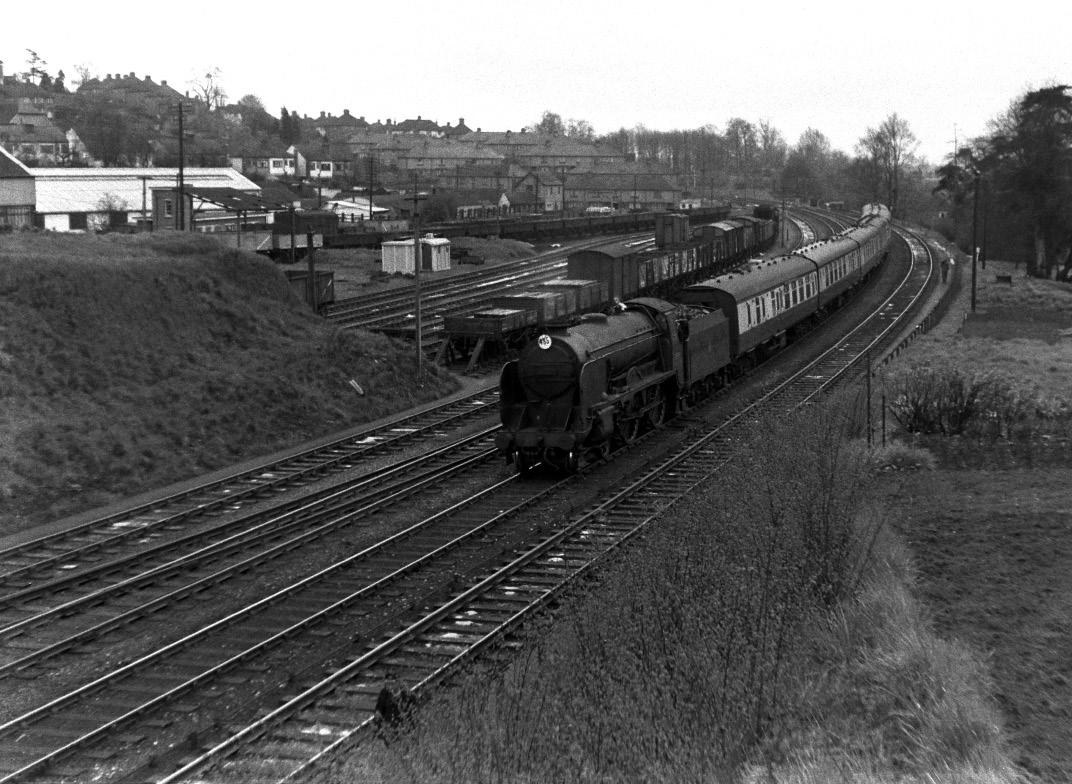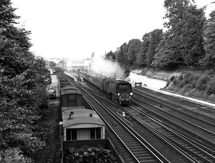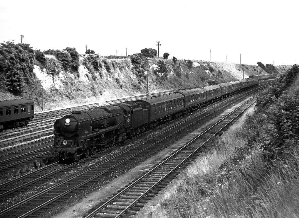 A down West of England service passing Barton Mill sidings, east of Basingstoke behind Merchant Navy 35006 Peninsula & Oriental SN Co on 04 August 1964; just two weeks before being withdrawn from service. The loco was new in January 1942, going to Salisbury shed where she remained for her entire working life: a unique claim amongst the Bulleid pacifics. Rebuilt between August and October 1959, this was the last original MN on the South Western section. After withdrawal, the loco was stored at Eastleigh until March 1965, then being sold to Dai Woodham’s scrapyard at Barry. Resident there for no less than 18 years, only the loco was purchased for restoration by the Gloucestershire and Warwickshire Railway, as the tender had already been sold to another group restoring a different Merchant Navy. This took a further 33 years, and included the construction of a new tender, enabling the loco to re-enter public service in May 2016. At the time of writing, the loco is operational and has visited several other heritage railways since 2016. The train is just eight coaches, so relatively light, but 4 August was the Tuesday following the August Bank Holiday, so perhaps that explains things. The stock comprises BR Mk 1 three-set 529, with the composite replaced by a Bulleid vehicle, a BR Mk 1 brake composite, BR buffet and dining car with a Bulleid two-set on the rear and may be the 1pm from Waterloo to Exeter and beyond. Through working from Waterloo beyond Exeter St Davids would cease just a month later as Western Region control of all former Southern lines west of Salisbury finally took full effect. Life would never be the same again… A. Swain Q21-4