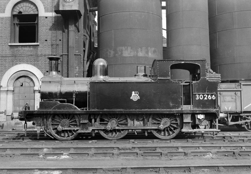 From time to time, usually when Eastleigh was inundated with work, Brighton would undertake overhauls of ex-LSWR locomotives. Here is a broadside view of smart-looking Adams G6 0-6-0T No 30266 alongside the water treatment plant, almost certainly after its final overhaul, sometime between 1951 and 1956; but probably nearer 1951 than later. There were 34 examples of the class, built at Nine Elms Works between 1894 and 1900, so some were completed under Drummond’s superintendency, and they varied somewhat in details. There were at least two (possibly as many as five) types of boiler fitted, together with at least two types of smokeboxes, although the overall dimensions of the two fittings combined did not vary by much. Also, where longer boilers were provided, then these engines had a slightly longer coupled wheelbase to accommodate the firebox between the rear pair of axles. It is all rather more complicated than previous texts would imply, so modellers beware! Only 12 received BR livery and numbers after 1948; most of the others were condemned between 1948 and 1951 still carrying Southern lettering, after which there was a lull until 1958. No 30266 lasted at Salisbury shed until late 1959. The final survivor was No 30238, which as departmental No DS682 had served at Meldon Quarry between 1960 and 1962. It replaced former classmate 30272 which, numbered as DS3152, had performed the same function from 1950 to 1960. K. Coursey 603