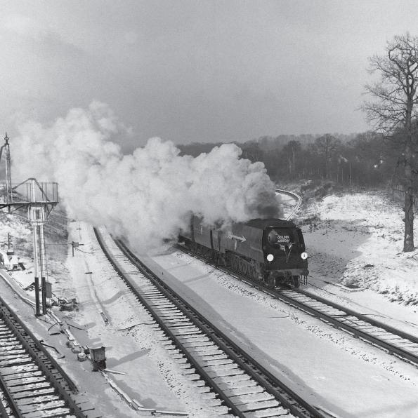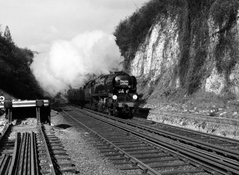 Going down the ex-South Eastern’s main line towards Tonbridge, the summit of the climb through the North Downs is reached at Knockholt, where rebuilt Bulleid pacific 34100 Appledore breasts the summit with the down Golden Arrow on 31 March 1961. Steam haulage of the train had less than three months to go and Appledore would oversee the final steam working on 11 June; watched and photographed by many along the route. Indeed, the loco had been on the duty constantly in that period; with BB rebuild 34088 being the other regular engine. On this day, there do not appear to be ordinary coaches in the train, but the luggage van on the front is a green painted BR general utility van. Non-railway observers in Kent might conclude that the locomotive was named after the village on the edge of Romney Marsh rather than the West Country town beside the River Torridge; the small scroll stating West Country Class below the nameplate being difficult to read as the loco flashed past at 60mph! After her Stewart’s Lane days were over, the engine moved to Brighton and thence to Salisbury in September 1963. The writer did not see the engine through Surbiton (his most regular spotting location) again until that time and his last sighting was at Basingstoke shed in June 1967, a fortnight before withdrawal. D. Clark 1993