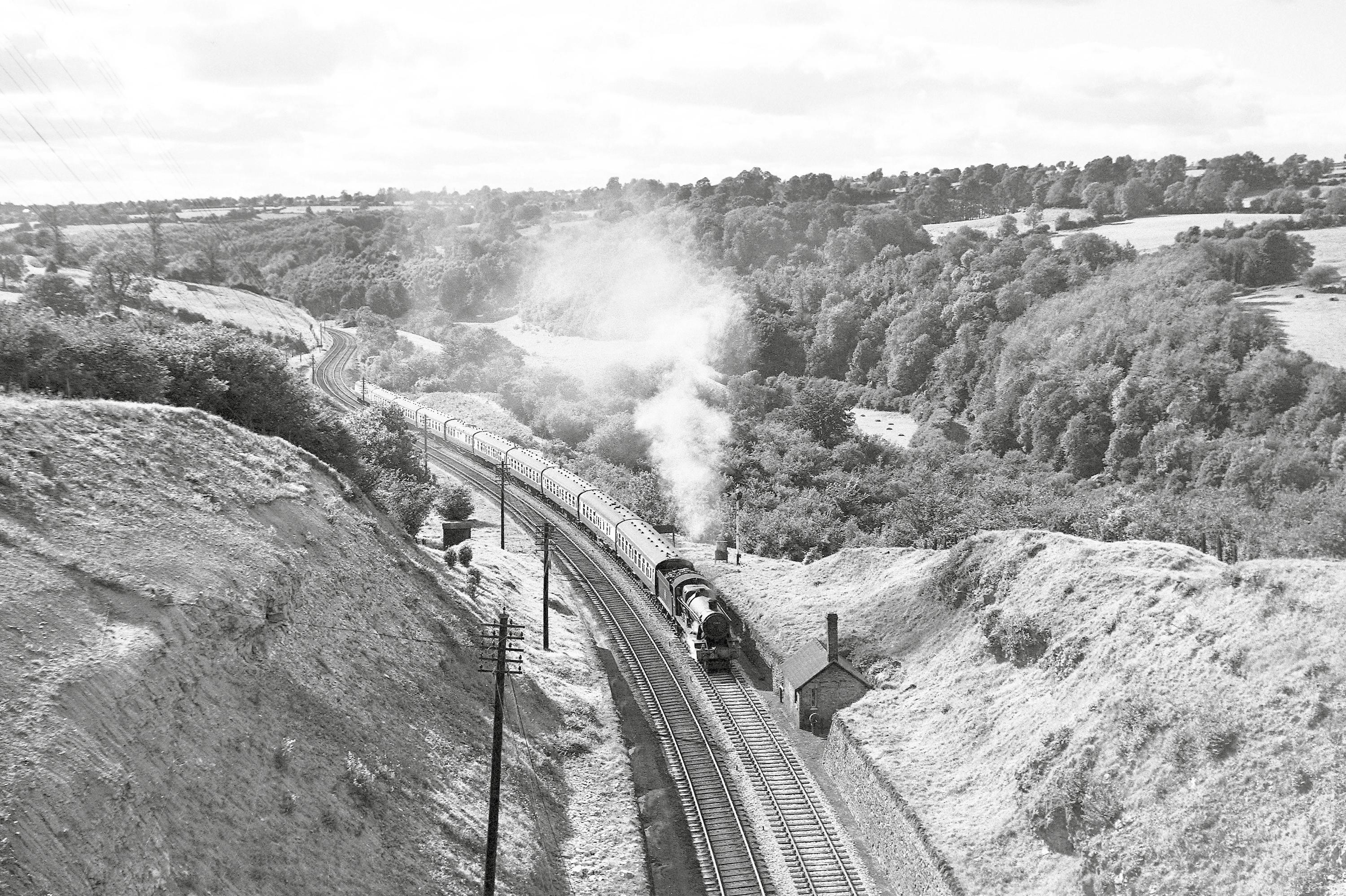 Top: In the high Summer of 1956, Hawksworth ‘Modified Hall’ No. 7903 Foremarke Hall ascends Sapperton Bank and approaches the western portal of Sapperton Tunnel with the 3.55 pm ‘Cheltenham Spa Express’ to Paddington. In contrast to the previous view, this train comprises BR Mk.1 stock, except for the sixth coach which is a Diagram H33 Cross Country Composite Diner. George Heiron (1280).
