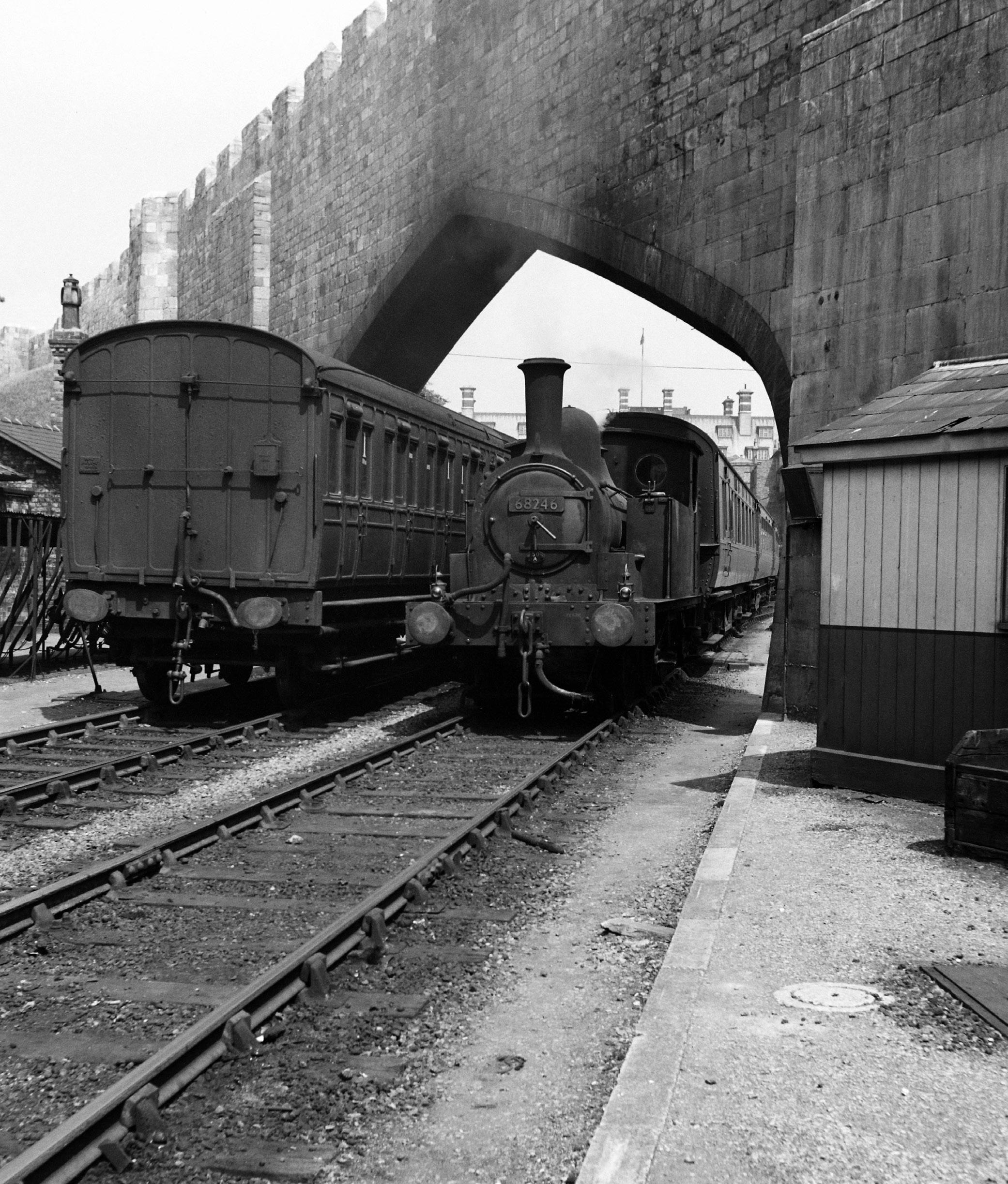 Controversially, Hudson wanted to bring the Y&NMR into the heart of the city which meant breaching the ancient city walls, but in such a way as to reinstate the sacrosanct walkway along the crest of the wall. A plan by G.T. Andrews was accepted which sympathetically inserted a Tudor-style archway allowing a two-track approach to the station throat. Posed under the arch whilst shunting carriage stock on 16 June 1951 is long-term York resident Class J71 0-6-0T No. 68246, a veteran from July 1889 and regularly seen on pilot and shunting duties in the immediate area. The loco was occasionally loaned out with other members of the class to the Easingwold Railway when it was temporarily bereft of its single loco and also on one occasion powered an RCTS open wagon special along the line on 23rd June 1957. No. 68246 lasted at York until withdrawn in November 1958. AF0246