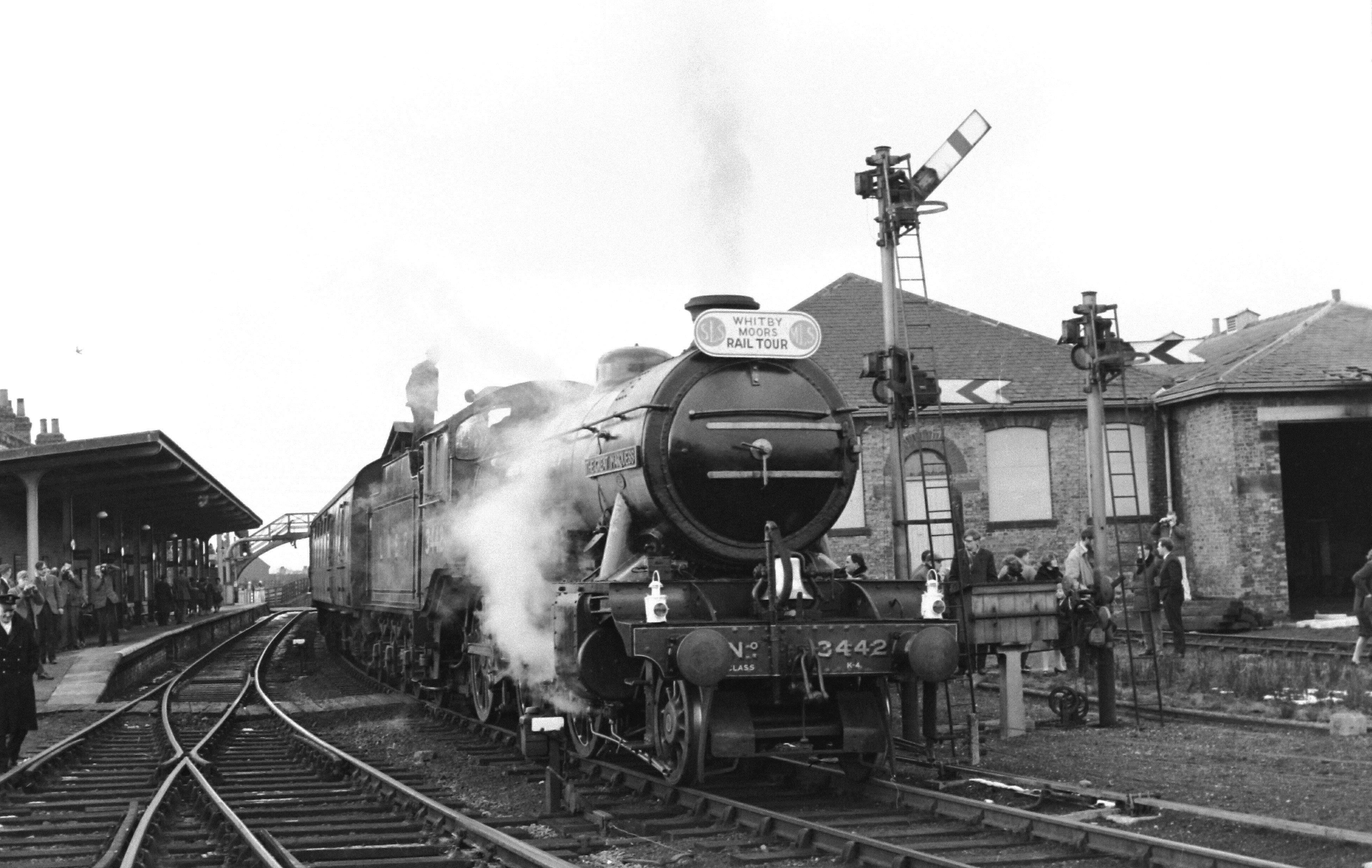 On 6th March 1965 the preserved Gresley K4 2-6-0 No. 3442 The Great Marquess paused at Market Weighton with the SLS/MLS ‘Whitby Moors Rail Tour’. The trip started at Manchester Victoria with No. 3442 replacing Jubilee 4-6-0 No. 45698 Mars at Wakefield Kirkgate before moving on to Market Weighton where K1 2-6-0 No. 62005 was attached for the continuation of the trip to Scarborough and Whitby. The return to Manchester was via Malton and York where the K1 came off leaving No. 3442 to run to Wakefield where the Jubilee came on and completed the return to Manchester. The train is seen at Market Weighton where tour passengers make the most of the stop to take photographs prior to the attachment of the K1. The station had an overall roof until 1947/8 when it was replaced by platform awnings. All four of the routes which passed through Market Weighton became victims of the Beeching ‘Reshaping’ plan with the last being the Beverley-York line; the closure of which from 29 November 1965 also saw the complete closure of Market Weighton station. NS200300