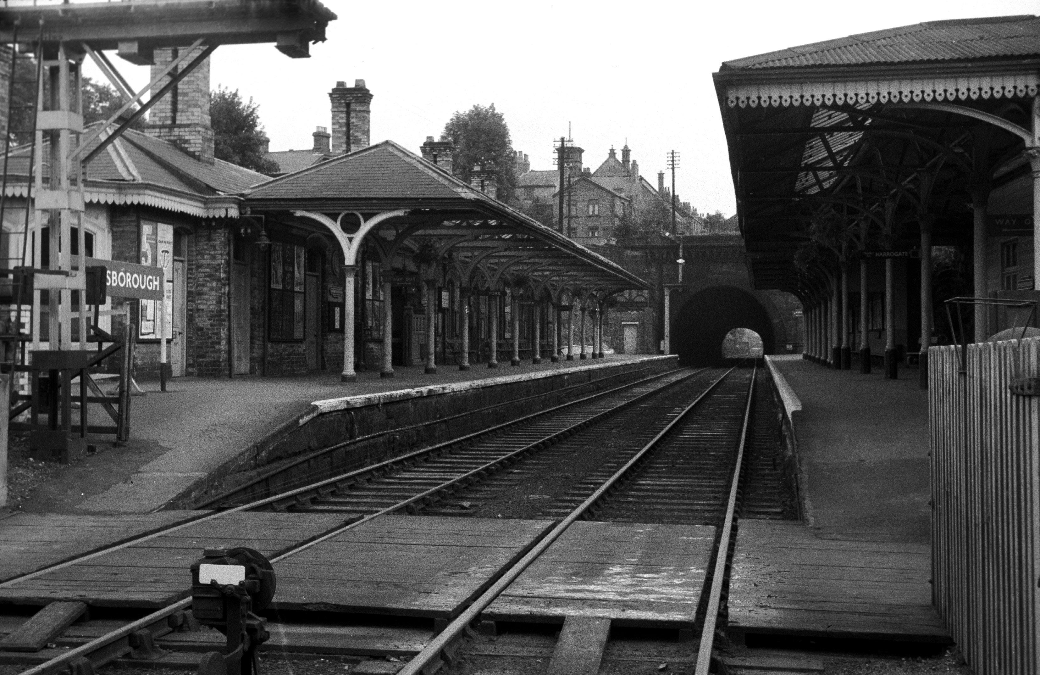 hauled by immaculate King’s Cross A4 Pacific No. 60030 Golden Fleece. for 1960 but postponed because of the lack of diesel power to cover briefly appeared named as Great Snipe but a change of policy green on 12th September to reappear blue and nameless six days overhaul at Doncaster visit before withdrawal with four other King’s CrossThe station at Knaresborough was opened by the Y&NMR on 1st October 1851 and replaced a temporary structure to the east of the town opened by the E&WYJR in October 1848 as a consequence of the collapse of the viaduct over the River Nidd on 11th March 1848. In 1865 the NER rebuilt the station to a design by their chief architect Thomas Prosser and there was a further rebuild in 1890 resulting in the fine structure as seen on 21st September 1958 looking north-east from the level crossing to the tunnel running under the High Street. The building was Grade II listed in 1986 and, although now unstaffed, the buildings on the eastbound platform are in private commercial use with one now tastefully restored as ‘The Old Ticket Office’ café in the former booking office. BHF