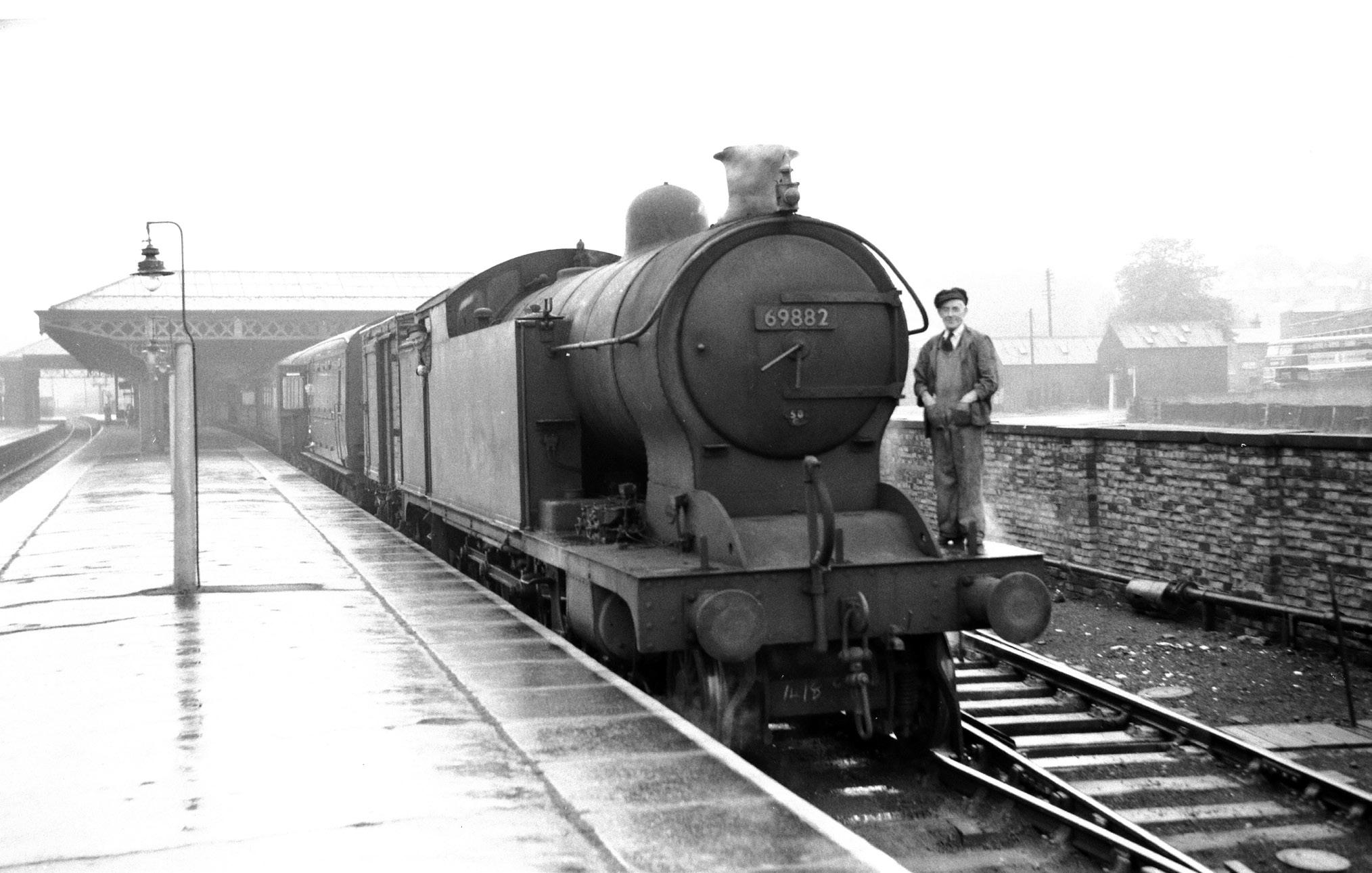 Bottom: In this early 1950s view, the crew of LNER A8 4-6-2T No. 69882 of Whitby shed take time to smile for the photographer despite the rain while preparing to leave with a train for home. Originally one of a class of fortyfive locos built by the NER as Class H1 4-4-4Ts between 1913 -21, the entire class was rebuilt by the LNER during the 1930s as 4-6-2Ts and reclassified ‘A8’. No. 69882 was rebuilt in February 1936 (then numbered 1503) and spent much of the early 1950s gravitating between Neville Hill and Whitby sheds until moved from the latter in June 1956 to Hull Botanic Gardens shed. While at Whitby they proved to be capable performers on the challenging Scarborough – Middlesbrough coastal route until displaced by DMUs in the mid-1950s. No. 69882 survived until November 1958 when it was withdrawn from Thornaby shed. NS201835A