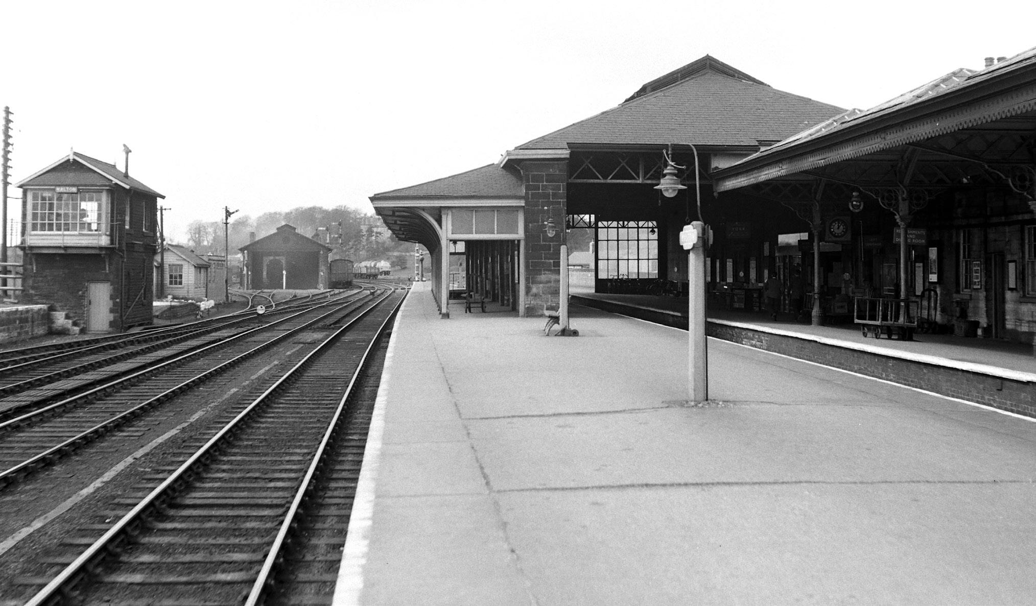 Top: A 1950s view of a very trim Malton station (surely a modeller’s dream!) looking from the east end of the island ‘through’ platforms towards York. The station was located on the southern bank of the River Derwent and opened on 7th July 1845. Most noticeable in this shot is the George Andrews-designed overall roof with a weather screen at the distant end and a full width platform canopy extending from the roof supporting wall. The bay platform for the Whitby and Driffield services is out of sight to the right under the canopy which extended behind the photographer. The main platform facilities are also seen to the right. Malton Station signal cabin is seen to the left and was one of three in the immediate area operational by the 1870s – East and West being the other two. The ‘Station’ cabin dated from 1873 and was an ‘S1a’ type with a Mackenzie & Holland 21-lever frame later extended to 55 levers in 1905. The cabin closed in May 1966. A feature of the platform operation until c.1966 was the solution adopted by the NER to allow passengers to access the island platform without recourse to a footbridge or boarded crossing. Instead, a movable section in the form of a wheeled trolley running on rails was installed and set at right-angles to the single running line. When the line was in use the trolley was wheeled back under the Up (York) platform and interlocked with the signals giving access to the platform. NS201835