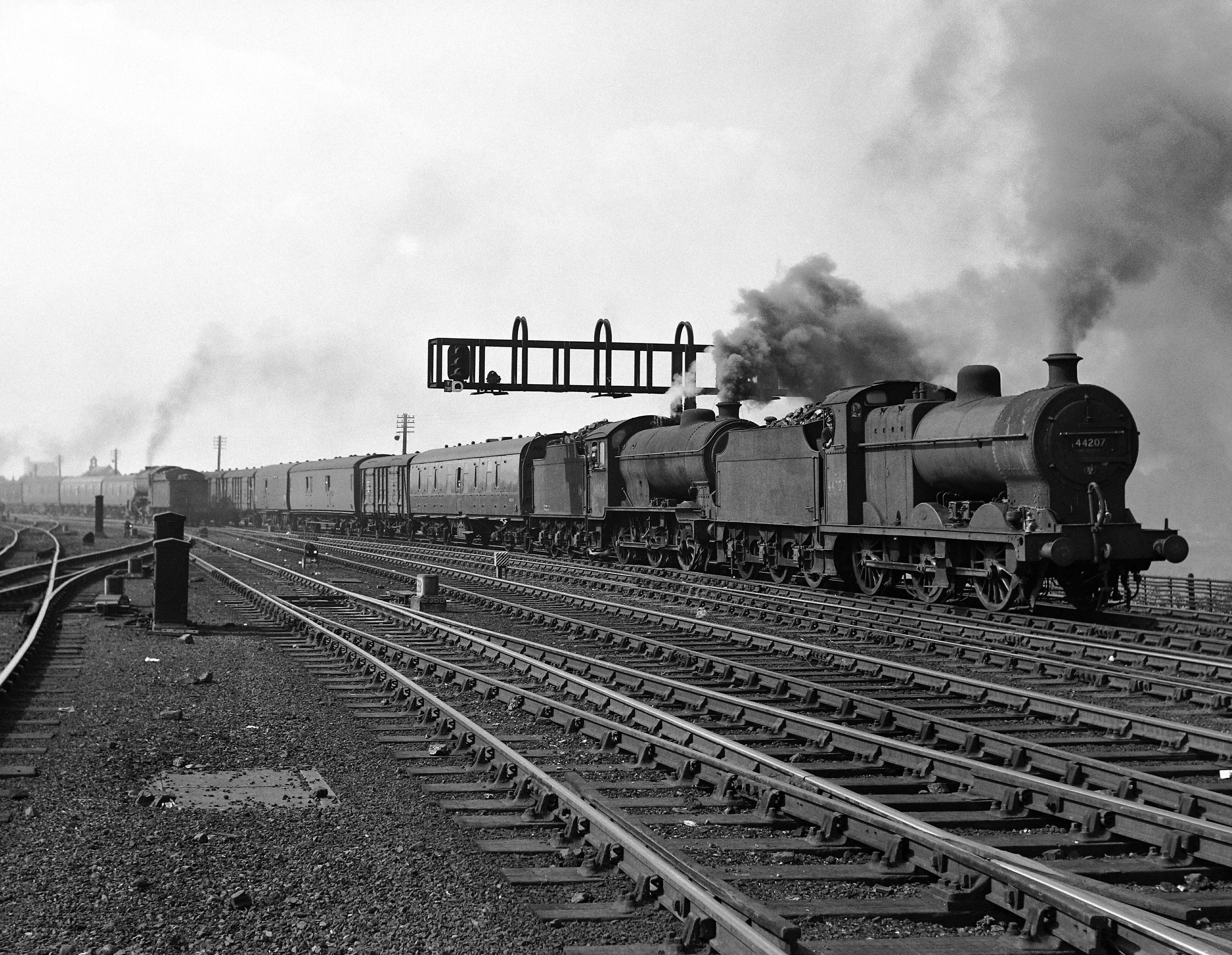 On 22nd August 1959 LMS Class 4F 0-6-0 No. 44207 from Leeds Stourton shed and a Class J39 0-6-0 (probably No. 64824 of Gorton shed returning home) pass North shed engine yard most unusually double heading the Class C Heaton – Manchester Red Bank Carriage Sidings empty van train. The outward nocturnal working was mainly newspaper traffic from the presses of the Manchester newspaper world and rarely photographed, but the daylight returns to the city with twenty or more vans hauled by a variety of locos became favoured photographic subjects in steam days. The make-up of this particular train seen on this occasion was a typical mix of stock with at least three Southern Railway ‘PMV’ utility vans, three BR Mk 1 carriages and an LNER Thompson-era steel-bodied vehicle. The service remained doggedly steam-hauled until 1967. NS208396