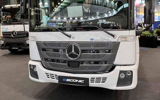 Letteralmente a fianco lo stand di Mercedes-Benz Trucks che ha mes so in mostra ben due veicoli in ante prima per l’Italia, più un terzo veico lo che abbiamo già visto a maggio a Transpotec. Le due anteprime, natu ralmente elettriche, sono l’eEconic, il veicolo dedicato alla raccolta dei ri fiuti urbani, e l’eCanter, il nuovo light truck di FUSO arrivato alla seconda generazione e svelato anch’esso, poco più di un mese fa, allo IAA di Hanno ver. Per accogliere al meglio le novità lo stand ha rispettato gli spazi dei due brand, con due aree dedicate rispetti vamente al marchio Mercedes-Benz e FUSO. Da segnalare, sotto il logo del la Stella, la presenza anche dell’eAc