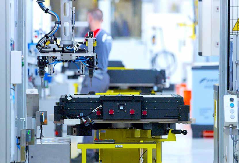 delle batterie, è l’introduzione di innovazioni rilevanti nelle linee di pro duzione con una forte collaborazione uomo-macchina grazie alle tecnologie Industry 4.0 adottate in tutte le aree, che consentono la raccolta e l’anali si automatica di tutti i dati indispen sabili per monitorare e migliorare la sicurezza, la qualità e la produttività. Tutti i processi produttivi si basano su magazzini altamente automatizzati per la gestione dei componenti e si svilup pano attraverso stazioni di assemblag gio a controllo elettronico.