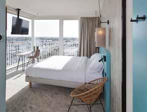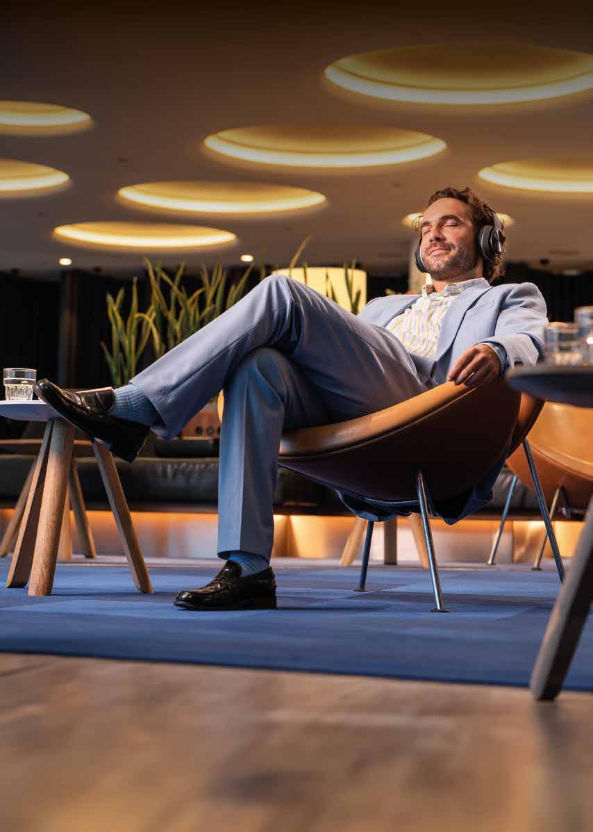 The hotel features 274 rooms spread across 23 floors. We stayed in a Premium Room with Skyline View high above the city. The moment the door opened, a sense of silence and well-being washed over us. The floorto-ceiling windows framed the Erasmus Bridge and Rotterdam’s imposing skyline—a view that seemed to be designed by Koolhaas himself. A handwritten welcome note added a personal and complete touch to the experience.