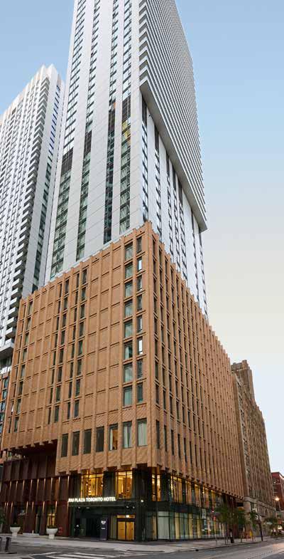 The hotel occupies 23 floors of one of two newly constructed, identical skyscrapers, each with 49 floors. Its striking façade combines historic charm and modern elegance: a brick-clad base that harmonizes with Toronto’s heritage buildings and a sleek glass tower that adds a bold, contemporary touch to the skyline.
