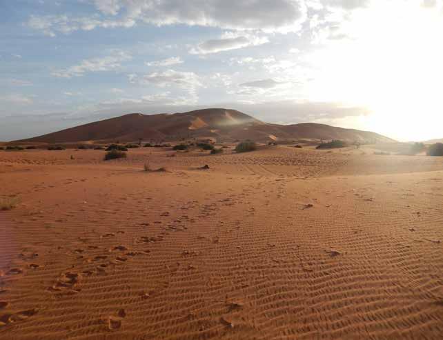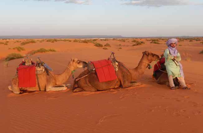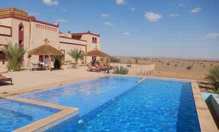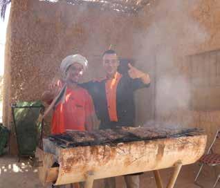 de grond steekt. Het is een prachtig gezicht en eigenlijk precies zoals ik me de woestijn voorafgaand aan de reis had voorgesteld. Langzaam verandert de stenen bodem in oranje zand. De chauffeur stuurt ons behendig door de duinen tot we de groene rand van een oase bereiken. Midden in de woestijn ligt Mines of M’lfis, een restaurant opgebouwd uit tenten en Perzische kleden. De geur van gekruid vlees komt ons al tegemoet. We eten en drinken heerlijk. Antoine Marthoz van communicatiebureau Insticom vertelt dat Marokko meer toeristen naar de woestijn wil trekken. "Toeristen gaan nu voornamelijk naar Marrakesh en Casablanca. Hoewel die plekken prachtig zijn, willen ze laten zien dat Marokko zoveel meer te bieden heeft. Veel mensen weten niet dat dit ook een optie is."