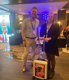 Jeroen Otto (Manager Sales & Retail de Jong Intra Vakanties) reikt de koffer uit aan de winnares van de quiz