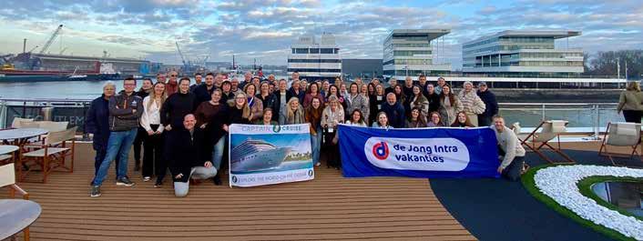 Captain Cruise), Gitte TilroHoogendonk (Business Development Manager Captain Cruise), Maaike van der Windt (directeur de Jong Intra Vakanties) en Jeroen Otto (Manager Retail & Sales de Jong Intra Vakanties). Captain Cruise en de Jong Intra Vakanties kwamen in contact tijdens de Vakantiebeurs, wat leidde tot verdere gesprekken en uiteindelijk tot een gezamenlijk riviercruise-aanbod. Van der Windt: ‘De Jong Intra Vakanties beschikt al over een groot riviercruiseportfolio en we hebben samen met Robert Pieter gekeken naar geschikte afvaarten. Riviercruises vormen een belangrijk en groeiend deel van ons aanbod. Ook het nieuwe boekjaar begint veelbelovend.’ Na een informele borrel aan boord volgden presentaties van beide organisaties, waarna de gasten genoten van een uitstekend diner. De avond eindigde