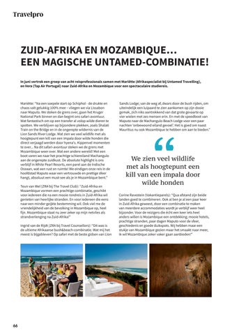 Mariëtte: “Na een soepele start op Schiphol - de drukte en chaos valt gelukkig 100% mee – vliegen we via Lissabon naar Maputo. We steken de grens over, gaan het Kruger National Park binnen en dan begint ons safari-avontuur. Wat fantastisch om op een transfer al volop wilde dieren te spotten. We verblijven op bijzondere plekken, zoals Shalati Train on the Bridge en in de ongerepte wildernis van de Lion Sands River Lodge. Wat zien we veel wildlife met als hoogtepunt een kill van een impala door wilde honden die direct verjaagd werden door hyena's. Kippenvel momenten te over... Na dit safari-avontuur steken we de grens met Mozambique weer over. Wat een andere wereld! Met een boot varen we naar het prachtige schiereiland Machangulo aan de ongerepte zuidkust. De absolute highlight is ons verblijf in White Pearl Resorts, een parel aan de Indische Oceaan, wat een rust en ruimte! We eindigen onze reis in de hoofdstad Maputo waar een vertrouwde en prettige sfeer hangt, absoluut een must-see als je in Mozambique bent.” Teun van Wel (ZRA bij The Travel Club): “Zuid-Afrika en Mozambique vormen een prachtige combinatie, geschikt voor iedereen die na een mooie rondreis in Zuid-Afrika wil genieten van heerlijke stranden. En voor iedereen die eens naar een minder geijkte bestemming wil. Ook viel me de vriendelijkheid van de bevolking in Mozambique op, heel fijn. Mozambique staat nu zeer zeker op mijn netvlies als strandverlenging na Zuid-Afrika!” Ingrid van de Rijdt (ZRA bij Travel Counsellors): “Dit was is de ultieme Afrikaanse bush&beach-combinatie. Wat mij het meest is bijgebleven? Op safari met de beste gidsen van Lion