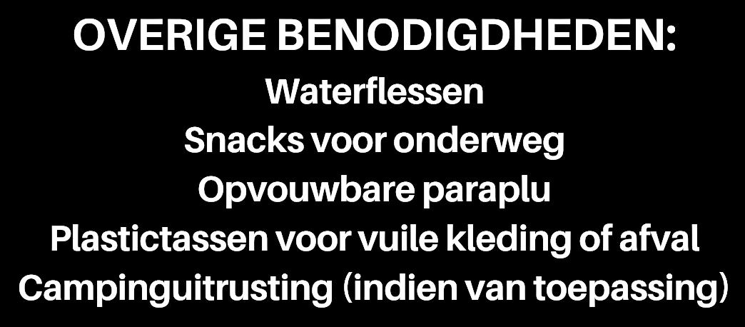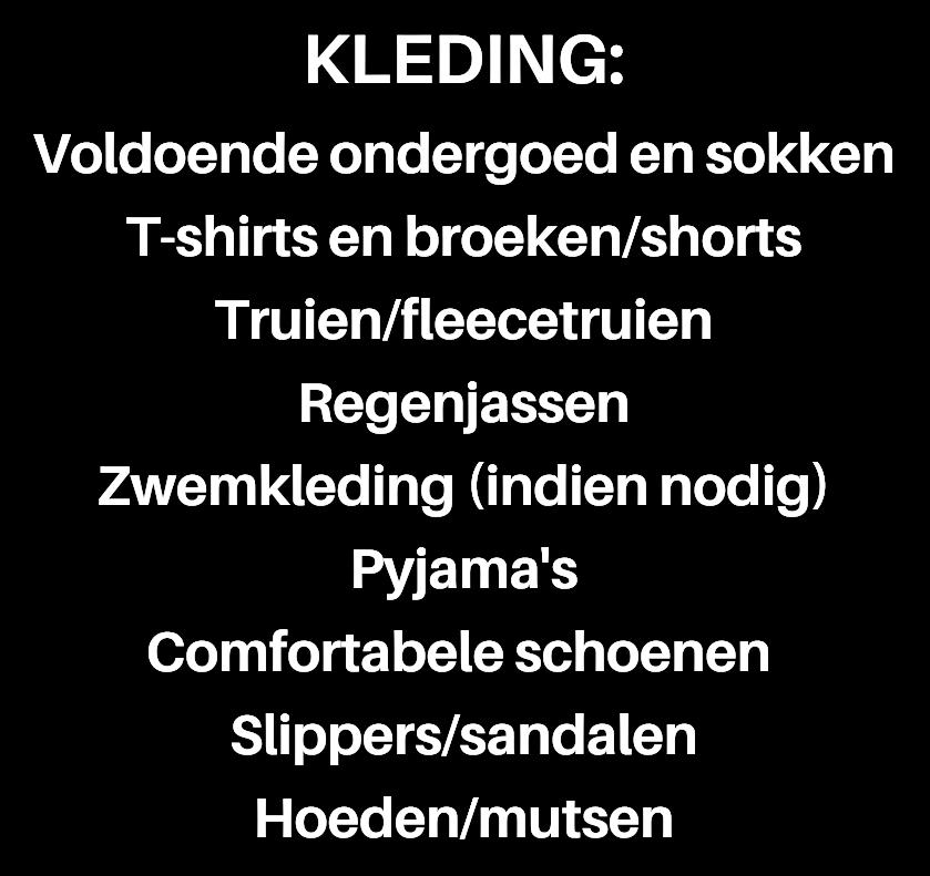 Neem comfortabele kleding mee voor je kids die geschikt is voor het weer en de activiteiten. Vergeet ook niet zonnebrandcrème, insectenspray en eventueel een EHBO-kit mee te nemen Lekker vies worden hoort er natuurlijk bij, dus een extra setje droge, schonen kleren kan geen kwaad