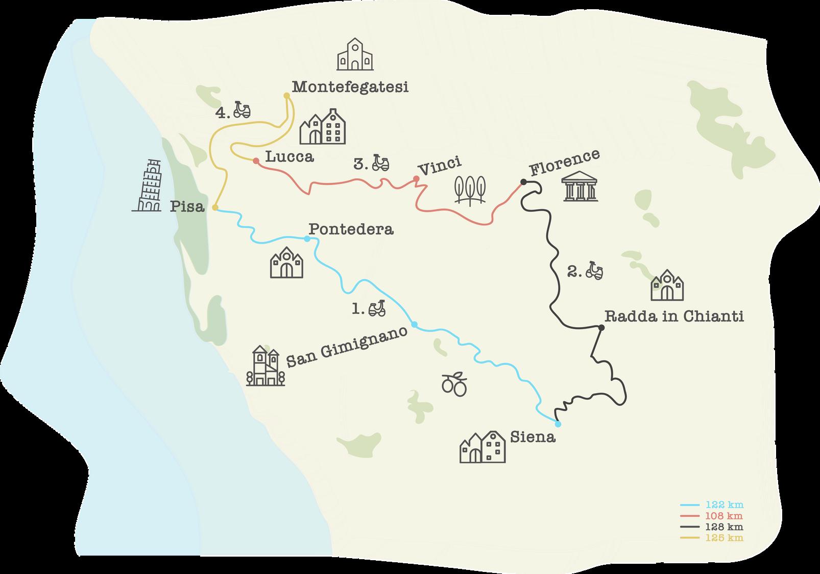 Il Giro Classico vertrekt en komt aan in Pisa, de etappes zijn telkens tussen de 70 en 120 km Je kan er dagelijks voor kiezen om in je eentje de route te doen (met behulp van roadbook & gps), of onze gids te volgen om helemaal zorgeloos te rijden