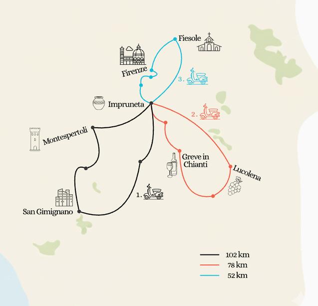 Deze route is gemaakt om er met de Vespa te rijden, het kan niet anders! De wegen zijn te smal om er met de auto te passeren Hier verken je het geboortedorpje van Leonardo Da Vinci