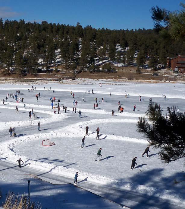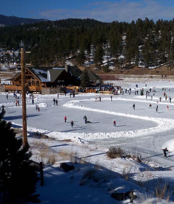 An hour south of Boulder lies Evergreen Lake, the largest Zamboni-groomed outdoor ice rink in the world. It spans 8.5 acres and offers several activities, from public ice skating and introductory classes to pick-up pond hockey. Groups can also reserve a rink to play broomball, a sport that blends hockey and soccer strategies. Broomball equipment, as well as skate rentals, can be collected from the Evergreen Lake House.