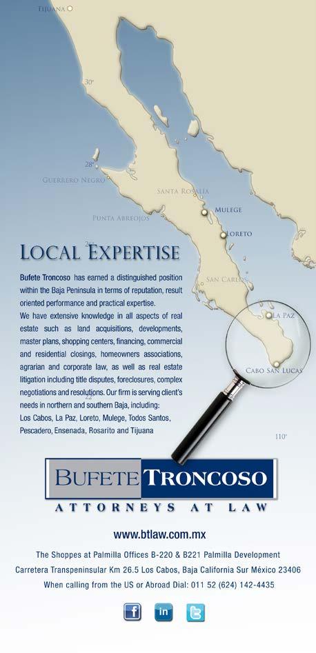 www.boydlawapc.com San Diego 619.232.1206 Orange County 949.753.1028 Los Angeles 310.777.0231 Sacramento 916.840.2050 Top Attorneys Representing Executives and Celebrities INTERNATIONAL ASSET DISPUTES CISSN 1941-3076 BajaTRAVELER® is an annual publication with a twelve-month distribution, edited in six languages, sold and distributed throughout the U.S., Canada, Mexico, Australia and parts of Europe, South America and Asia.