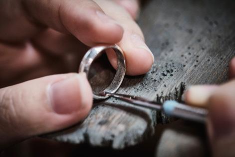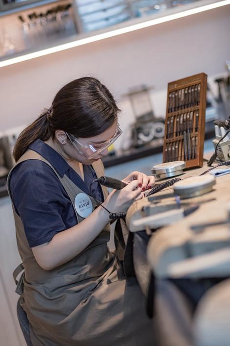 Today, despite being kept busy overseeing her muchexpanded business, Liu still finds time to design two new collections per year. Looking around at the décor of Kinjo’s flagship Shilin store, it is clear to see that she takes many of her aesthetic cues from the natural world. The color palette is an understated mix of oatmeals, slates, and warm, earthy browns, the simplicity of it allowing your eye to be drawn instead to the texture of rocks and wooden surfaces that dot the airy workshopcum-café. When asked if such forms provide inspiration, Liu agrees, pulling up an image of a ring from her current season, which looks to be modeled on the cuboid crystal clusters of pyrite. But – ever the businesswoman – she is quick to point out that personal aesthetics will only get you so far, saying she also has to pay attention to trends in the market and customer feedback.