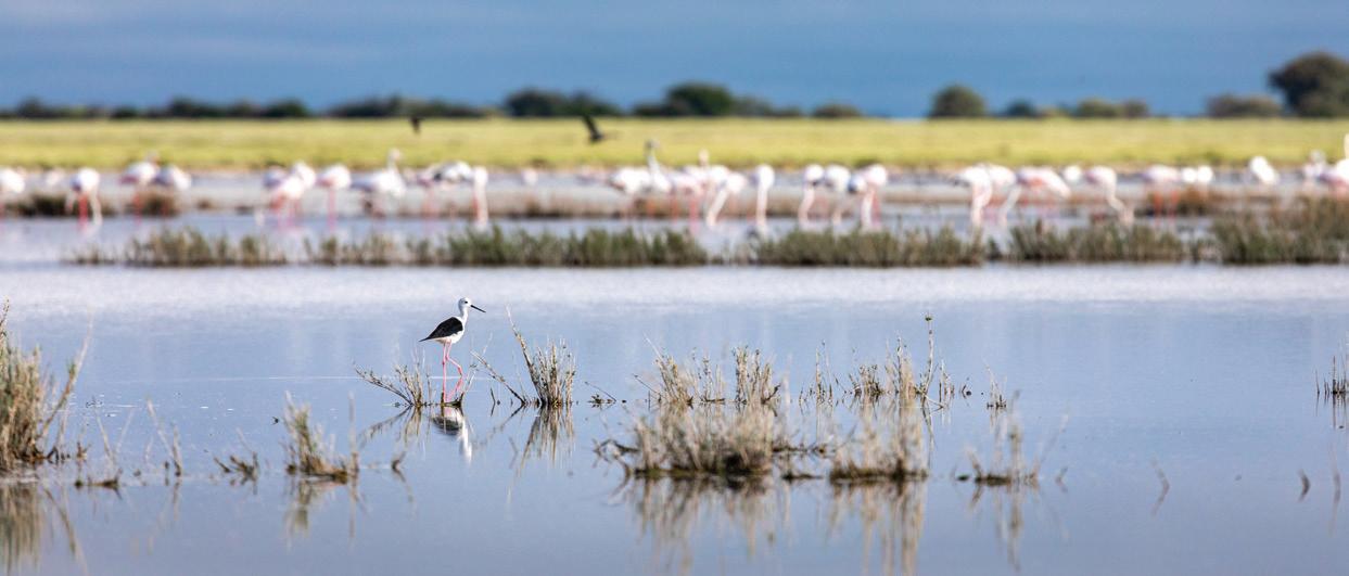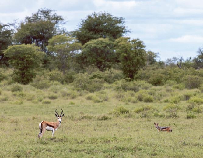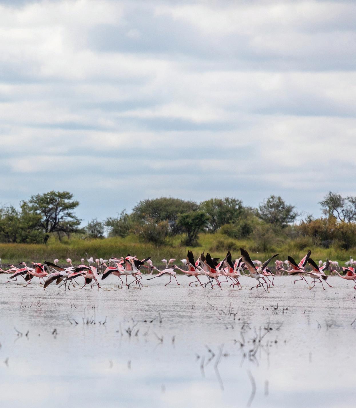 current inhabitants are juveniles, swaying their beaks through the shallow waters as they do their ballerina step. Near the end of the Fisher’s Pan loop we finally find a herd of the large mammals the park is famous for. In a forest of our new favourite – the trumpet-thorn – the elephants wander. They notice us and a young bull curiously ambles closer, as they are prone to do. A lift of the trunk to scent the air and a flap of ears to show us he knows we are here, and he is off to explore more interesting things.