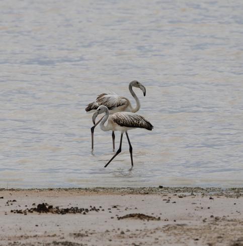 After driving through an incredible summer shower, the only animals glimpsed through the frantic whoosh-whooshwhoosh of wiper blades being the silhouettes of rather miserable looking blue wildebeest, we reach the eastern edge of the Great White Place. A loop around the gigantic Etosha Pan’s smaller neighbour, Fisher’s Pan, rewards us with water bird sightings, including Yellow-billed Storks and both Greater and Lesser Flamingos. Like the trumpet-thorn flowers, the mud-caked rhino and the great pan itself, the flamingos are white. This is a popular breeding area and most of the