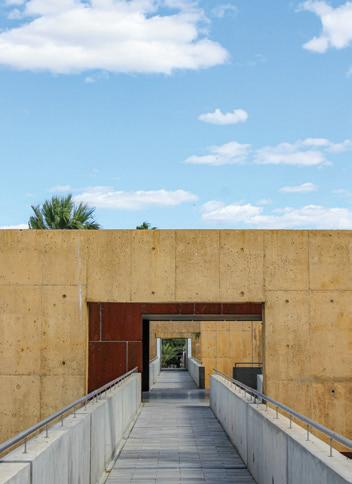 The gates seem to disappear among the sheer size of a brutalist, elaborate rammed earth wall, also known as the entrance. It feels like we have taken the wrong exit, got into a time machine and somehow landed on the set in a dystopian, sci-fi blockbuster movie.