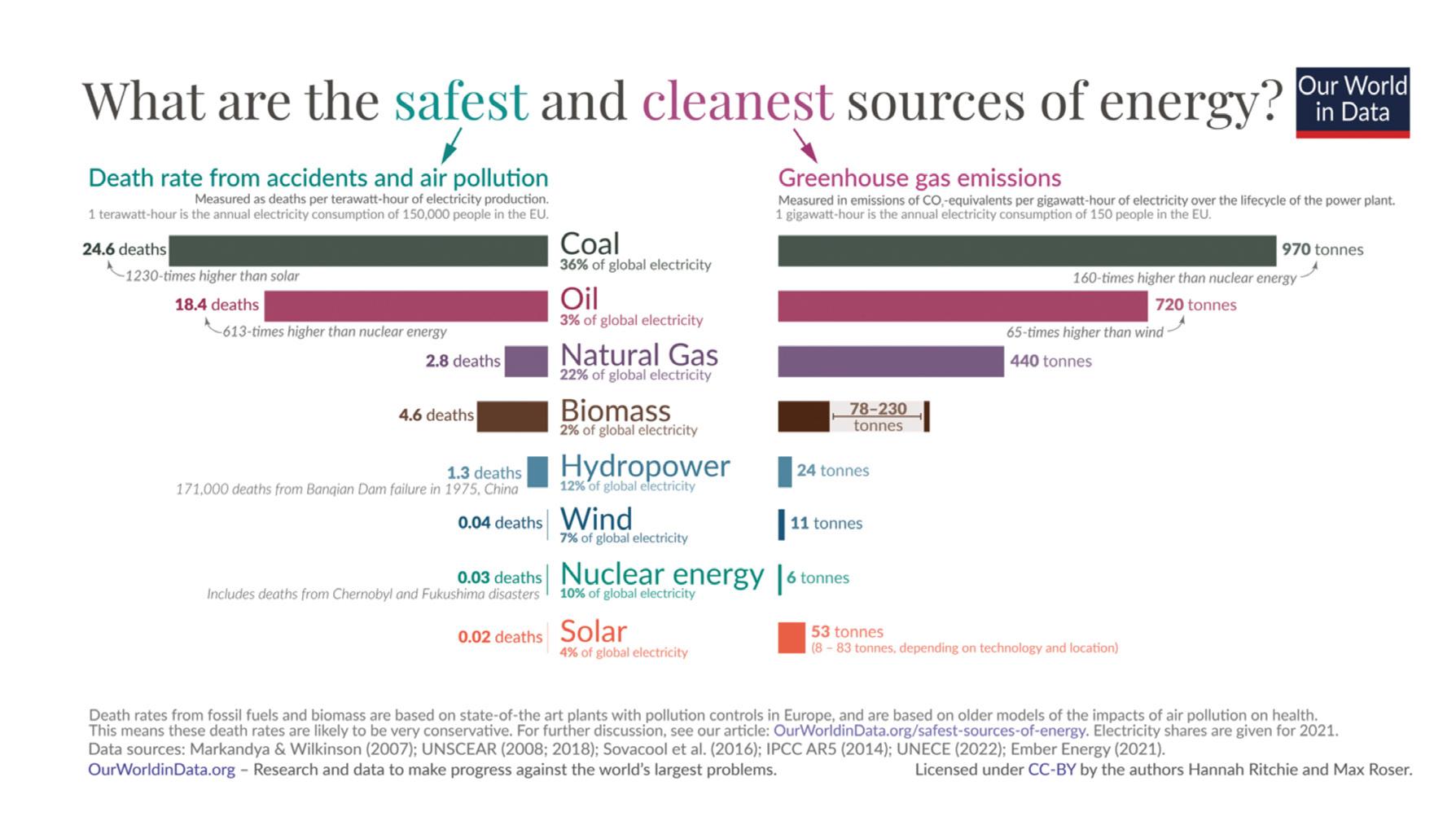 Nuclear energy is one of the cleanest forms of energy, with even lower greenhouse gas emissions than solar and wind power when the whole system is taken into account (e.g., production and disposal of materials, known as cradle-to-grave). Contrary to popular opinion, nuclear energy is also safe ‒ besides a few well-publicised disasters caused by earthquakes (Fukushima, Japan) and accidents at outdated facilities due to human error (Chernobyl, Russia) ‒ when measured as the number of deaths per terawatt-hour of energy produced globally, nuclear safety is comparable to wind and solar. The 820 deaths in the coal energy sector and 613 deaths in the oil energy sector, for each death in the nuclear energy sector, are seldom publicised.
